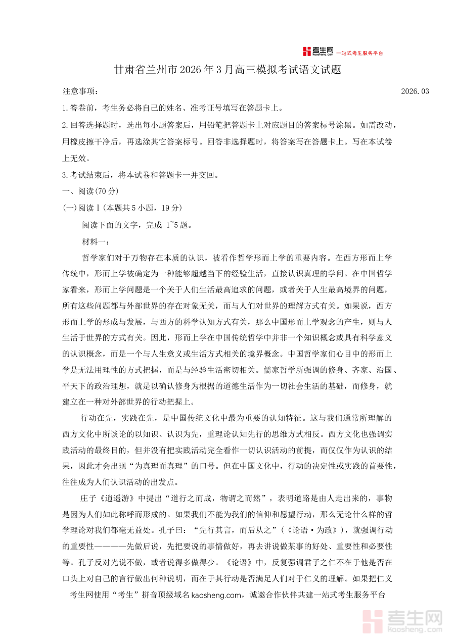 本资料适用于2026届甘肃省兰州市高三年级学生及语文教师群体,尤其适合处于下学期复习关键期的学生用于自我检测与备考规划,通过试题练习与答案参考,学生能清晰把握学习进度、明确复习重点方向,为高考备考积累实战经验,教师也可依托该资料开展针对性教学指导与训练部署。