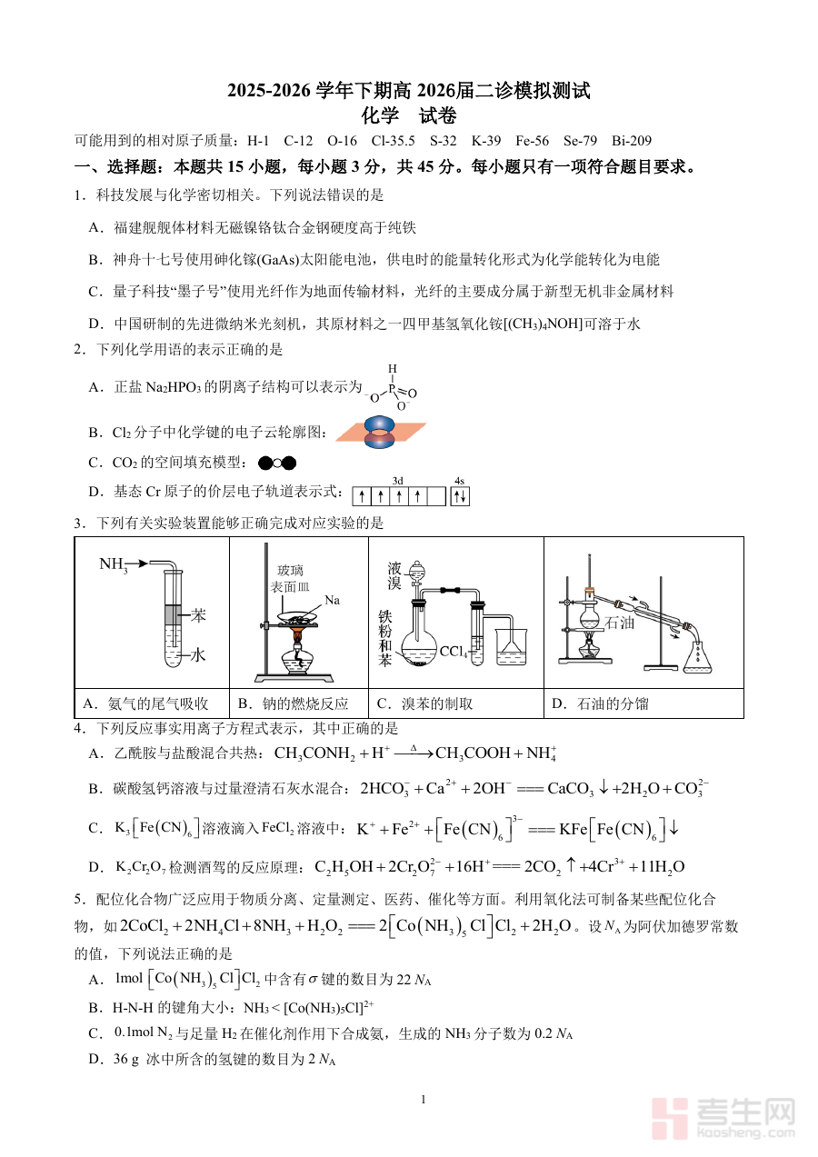 本资料主要适用于成都市第七中学高2026届学生,亦可供省内同类学校高三年级学生参考使用。通过参与该模拟考试,学生可提前熟悉二诊考试的形式与要求,提升应试技巧和时间管理能力,为高考化学科目的系统复习规划提供有力支撑,助力学生在高考中发挥最佳水平。