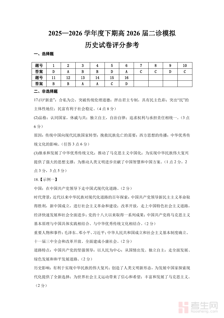 《成都市第七中学2025~2026学年度下期高2026届二诊模拟考试 历史答案》是成都市第七中学针对2025-2026学年度下期高2026届学生组织的二诊模拟考试配套历史答案资料,属于高三阶段关键模拟考试的备考辅助工具。该资料紧密对应本次二诊模拟考试的历史试题,为使用者提供了准确的作答参考,是衔接日常复习与正式二诊考试之间的重要支撑材料。