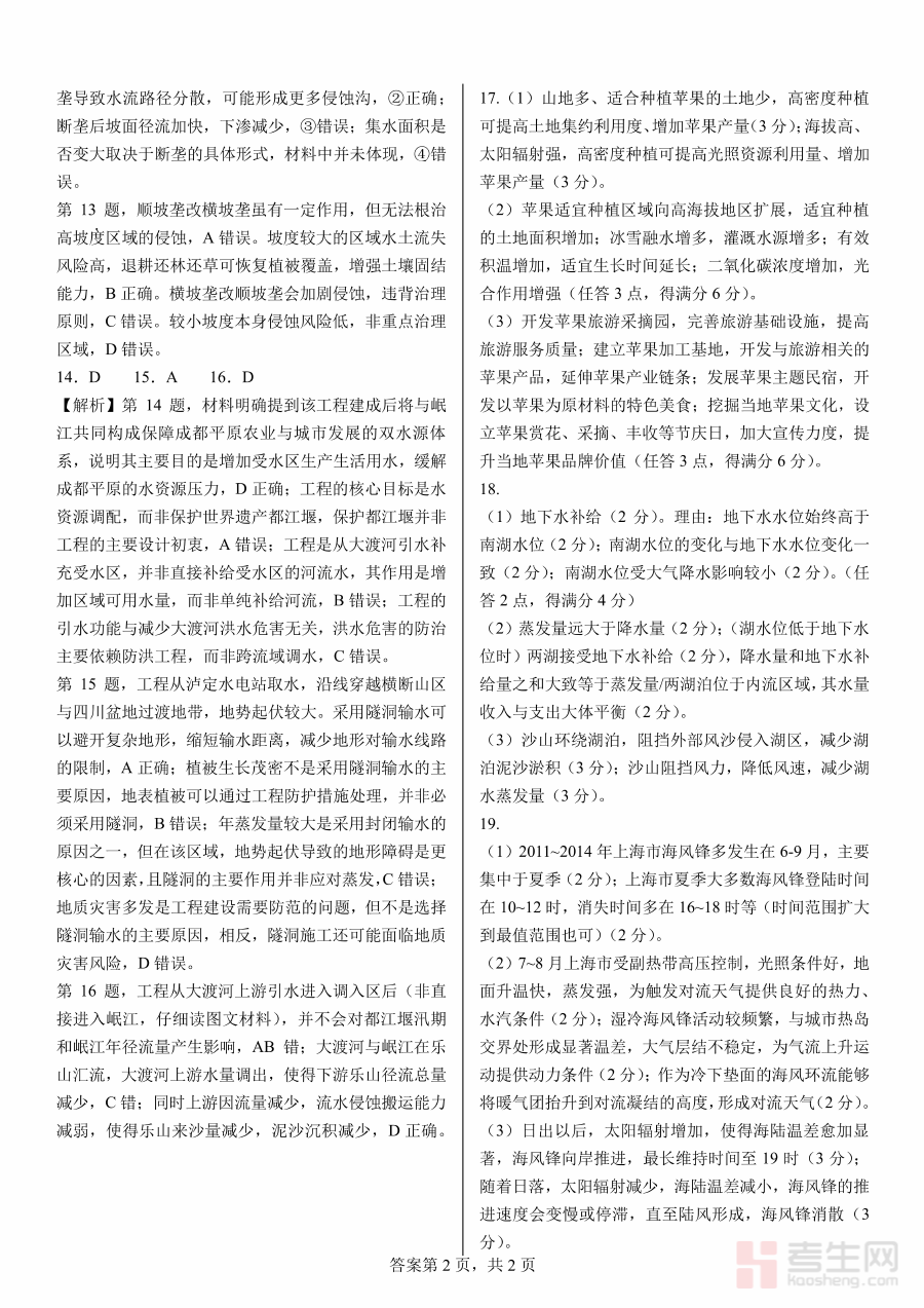 这份资料主要用于辅助师生完成二诊模拟考试后的学情诊断与教学调整工作。教师可通过该答案快速核对学生答题情况,精准识别班级整体在地理学科上的知识掌握薄弱点,从而优化后续教学计划与内容;学生则能借助答案进行自我测评,清晰了解自身答题的准确性与存在的问题,为制定个性化复习方案提供数据支撑。