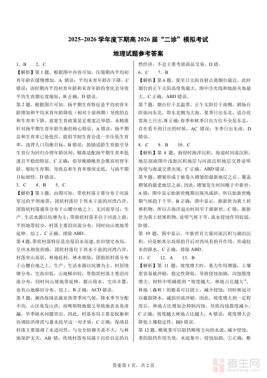 它适用于成都市第七中学高2026届的地理教师与学生群体,同时也可为同地区、同阶段的其他高中地理教学及备考提供参考价值。作为二诊模拟考试的配套答案,其核心作用在于帮助师生及时把握模拟考试的考查方向与评分标准,助力学生调整备考策略,提升复习效率,为正式二诊考试及后续高考备考做好充分准备。