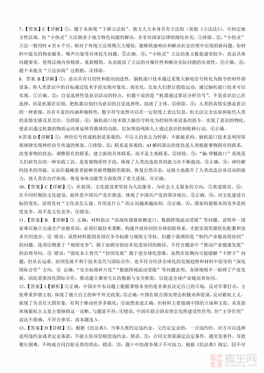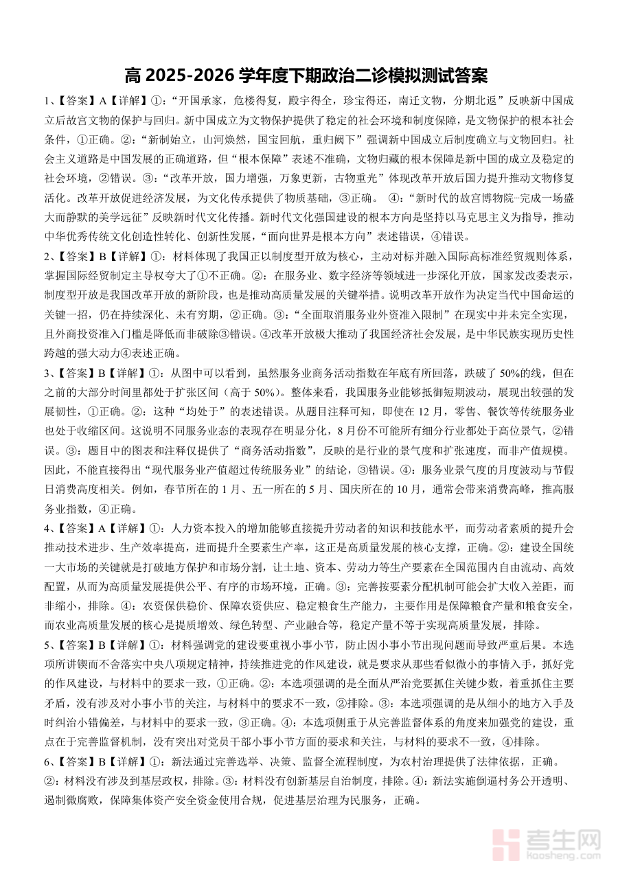 《成都市第七中学2025~2026学年度下期高2026届二诊模拟考试 政治答案》是针对成都市2025至2026学年度下学期、高2026届学生的二诊模拟考试政治科目的配套答案资料。该资料依托成都七中优质的教学资源与命题经验,紧密贴合当地高三阶段二诊模拟考试的考查方向与核心要求,为师生提供了对应考试的标准化参考答案支撑,是高三政治学科阶段性复习中重要的参考资料。