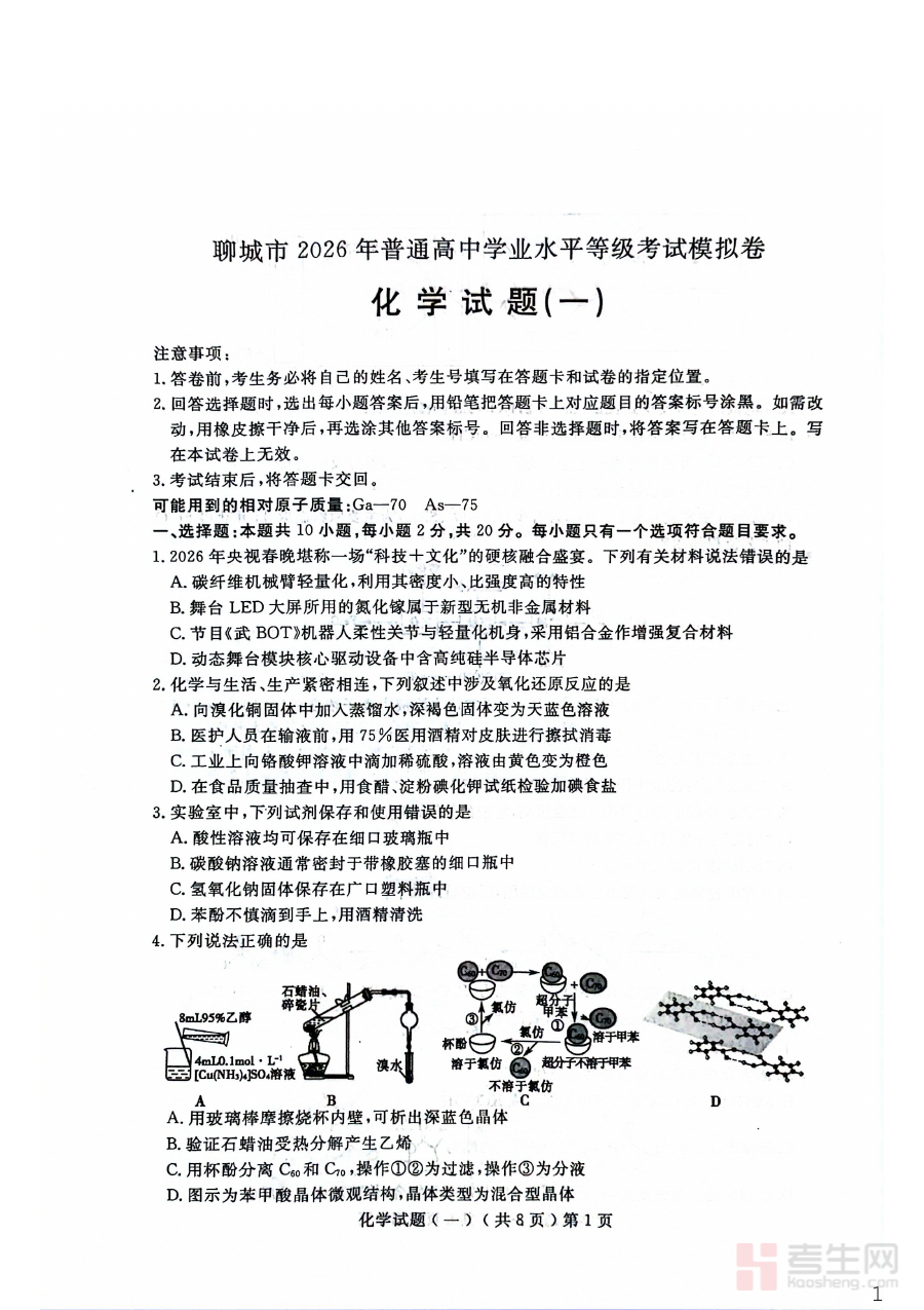 本模拟卷适用于聊城市2026届普通高中学生及化学学科教师,对学生而言其价值在于通过阶段检测熟悉考试形式与节奏、强化应试能力;对教师而言则是开展教学评估与针对性辅导的有效工具,共同为最终学业水平等级考试做好准备。