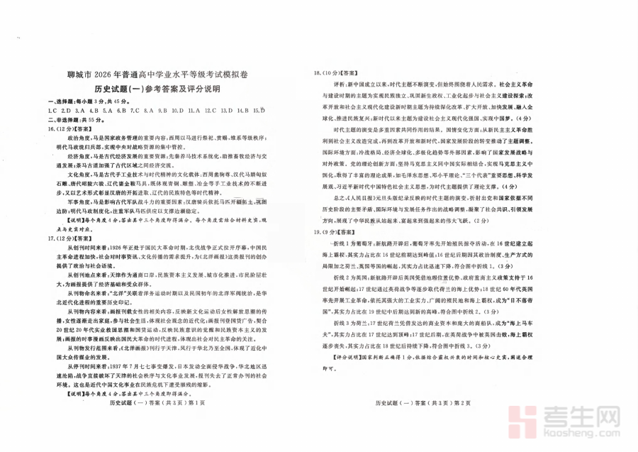 该资料主要适用于聊城市2026届普通高中在校学生,尤其是即将参加普通高中学业水平等级考试历史科目的考生,使用此答案资料能有效助力考生进行阶段性学习效果检测,及时修正备考策略,提升备考效率;此外也可为高中历史教师提供教学评估与辅导方向的参考依据,推动教学工作的精准化与高效化开展。