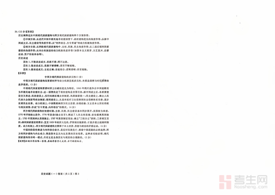 此资料的核心用途在于帮助考生完成对模拟卷作答结果的自我验证与深度分析,通过对照参考答案,考生能够清晰识别自身在历史知识理解、解题思路构建及答题规范应用等方面的优势与不足,为后续备考计划的优化调整提供精准依据,同时也可作为教师开展学情诊断与针对性教学指导的重要参考工具。