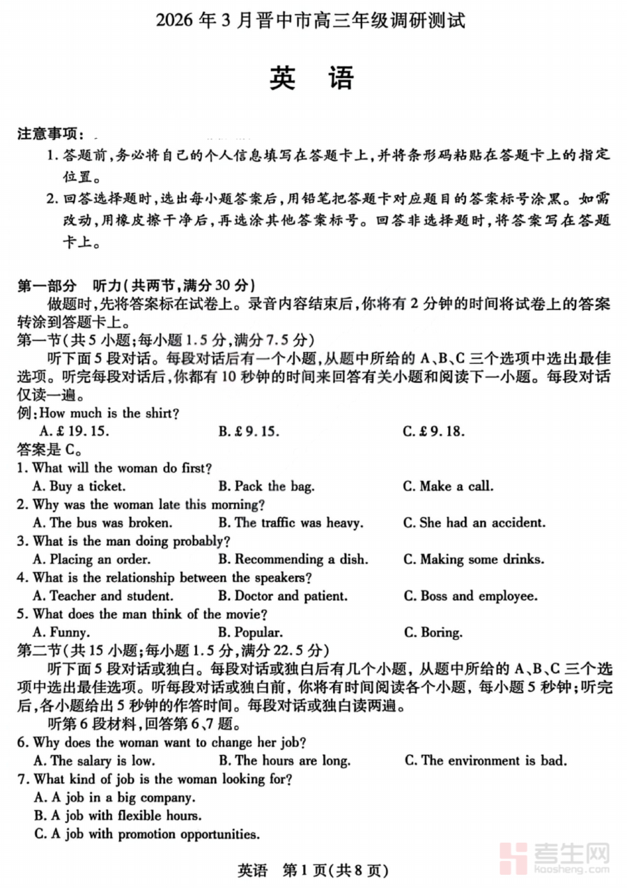 《山西省晋中市2026年3月高三年级调研测试 英语》是针对山西省晋中市2026届高三年级学生在2026年3月开展的英语学科调研测试相关备考资料。该资料依托晋中市本地教育教学实际及高三复习阶段特点,旨在为学生提供贴合区域考试要求的阶段性练习资源,帮助学生提前熟悉本地调研测试的命题方向与考查逻辑,为后续复习安排提供参考依据。
