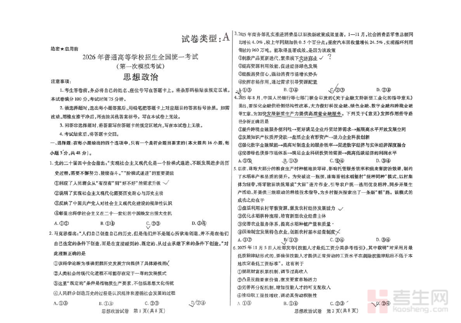 本试题适用于2026届内蒙古包头市的高三学生及相关政治教师。对学生而言,它是检验一轮复习成果、适应高考命题风格的重要工具;对教师而言,它能辅助优化教学策略、精准定位学生薄弱环节。无论是学生自主备考还是教师教学指导,该试题都能发挥重要作用,助力提升高考政治学科的备考质量与效率。