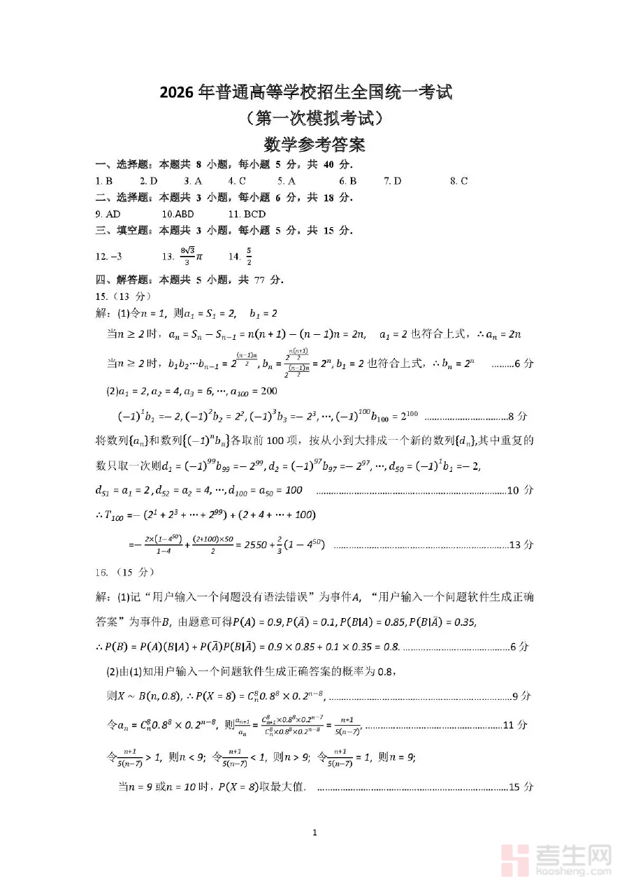 《内蒙古包头市2026年高三第一次模拟考试 数学答案》是针对内蒙古包头市2026届高三学生第一次模拟考试数学科目的配套答案资料。该资料与当地高三阶段首次模拟考试的数学试卷直接对应,能够为考生和教学者提供该次考试数学科目的标准解答参考,是高三数学备考过程中阶段性复习成果验证的重要辅助材料。