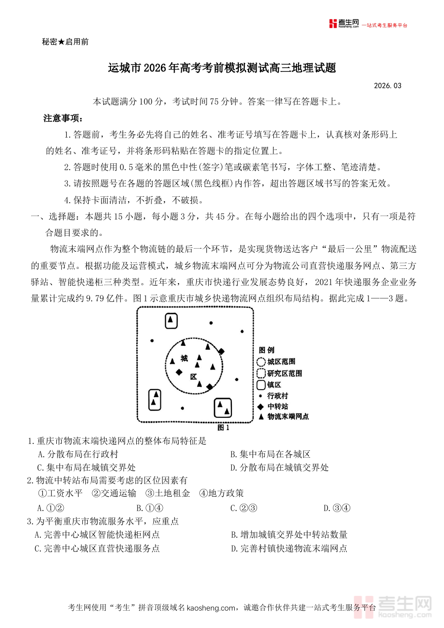《山西省运城市2026届高三下学期高考考前模拟测试地理试题》是针对山西省运城市2026届高三学生设计的高考地理考前模拟类资料,紧密贴合当地高三下学期的教学进度与高考地理命题方向,旨在为学生提供贴近真实高考场景的地理学科模拟训练机会,帮助学生提前适应高考地理的考试节奏与要求。