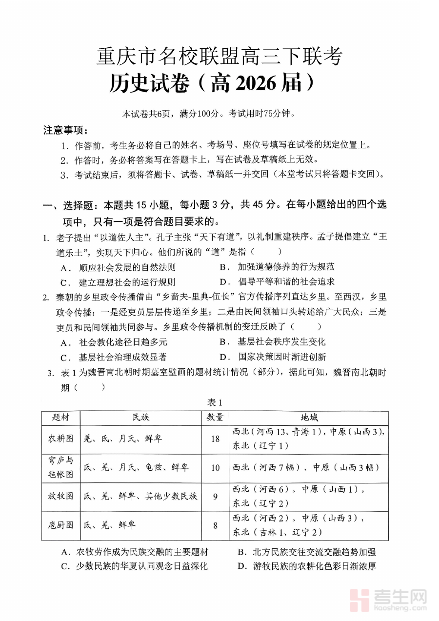 《重庆名校联盟2026届高三下学期第一次联考 历史》是针对2026届重庆市高三学生的历史学科阶段性考试资料。重庆名校联盟汇聚区域内优质高中教育资源,其组织的联考具有较强的区域代表性与备考参考价值,本次高三下学期第一次联考处于高考复习关键阶段,该资料能为考生提供贴合本地教学实际与考试趋势的历史学科备考支持。
