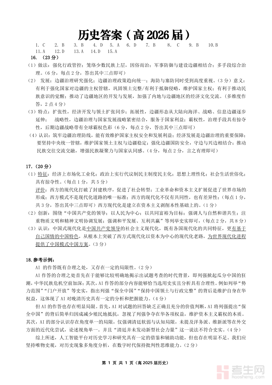该答案资料可支持考生完成本次联考历史作答的自我校验与情况分析,助力教学者开展学生阶段性学习成果的诊断与评估,同时为后续历史学科备考规划的优化提供数据支持,帮助师生清晰认知当前知识掌握水平与能力薄弱环节,进而更具针对性地推进下一阶段复习。