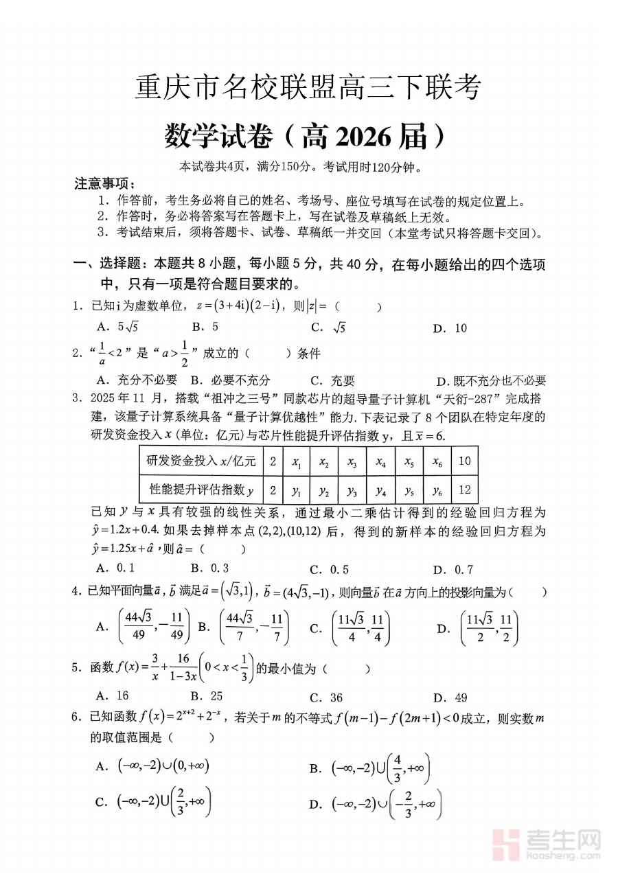 《重庆名校联盟2026届高三下学期第一次联考 数学》是重庆地区针对2026届高三学生组织的区域性联考类数学备考资料,由当地多所知名高中联合命题,属于高三下学期初期的重要阶段性检测资料。该资料紧密结合重庆高考数学的命题导向与区域教学特点,能够客观反映联盟内学校学生的数学学习水平与知识掌握情况,为后续的备考工作提供真实可靠的参考依据。