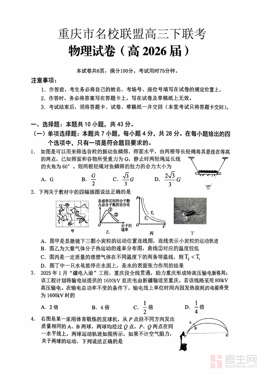 《重庆名校联盟2026届高三下学期第一次联考 物理》是面向重庆市名校联盟体系内2026届高三学生推出的物理学科阶段性备考资料,结合高三下学期初期的学习进度与区域教学特点,整合联盟内优质教育资源,为学生提供符合本地考试导向的实践载体,助力学生熟悉联考形式与考查方向,为后续的复习规划提供参考依据。