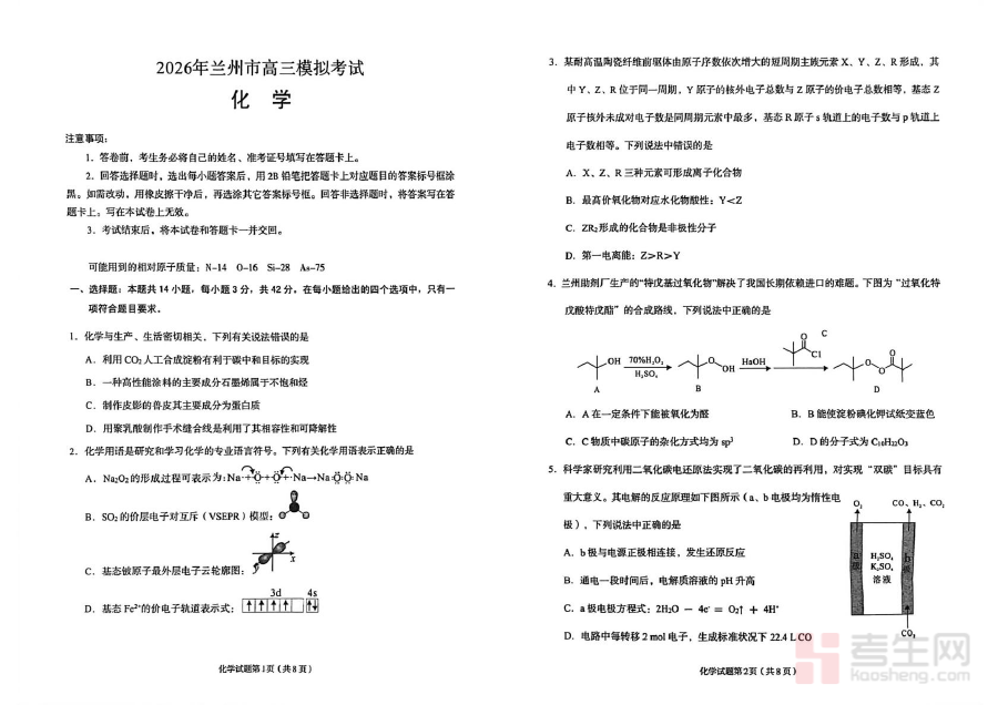 该试卷适用于2026届兰州市高三年级全体学生、高三化学任课教师及参与学生备考管理的家长群体。对学生而言,它不仅是阶段性知识检测工具,更是熟悉高考化学考试流程、提升时间分配能力与应试心理素质的重要机会,能为后续二轮复习的重点突破与三轮复习的综合提升明确方向;对教师而言,它是评估前期教学效果、优化备考策略的关键依据;对家长而言,它可帮助直观了解孩子学习状态,更好配合学校开展备考支持,形成家校协同合力。