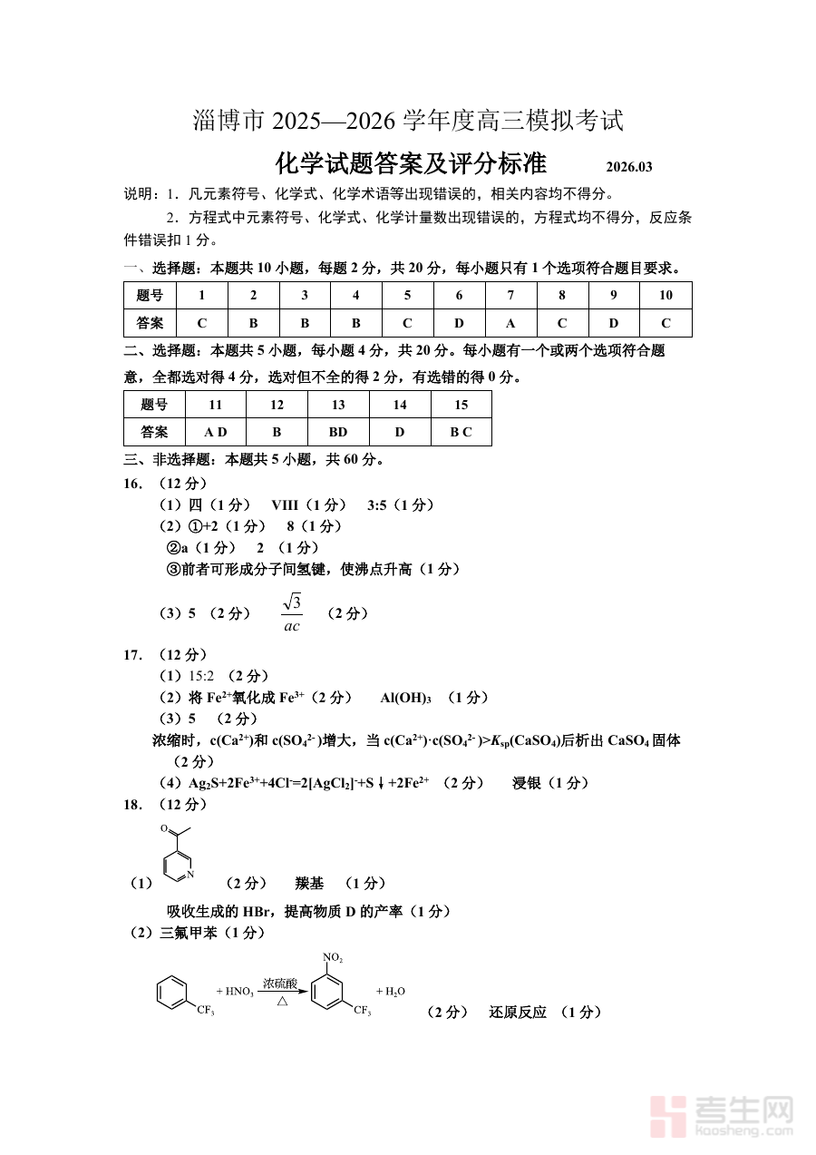 《淄博市2025-2026学年度高三模拟考试 化学答案》是针对淄博市2025至2026学年度高三化学模拟考试的配套答案资料,聚焦该学年度高三阶段化学学科的模拟测评需求,为相关考试的作答校验与后续分析提供直接依据,是衔接高三化学阶段性学习与备考调整的重要辅助材料。