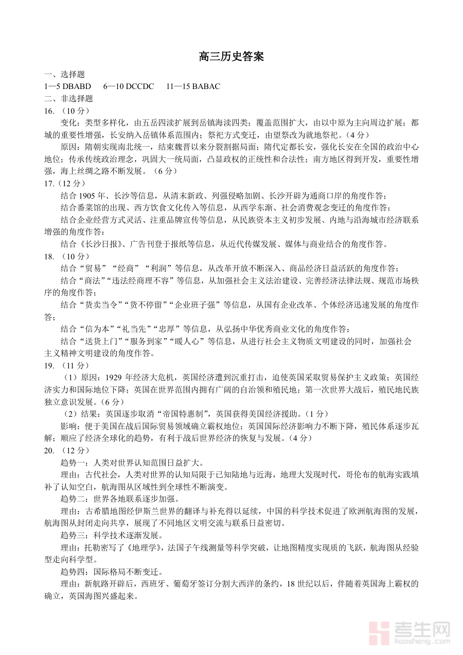 作为高三阶段阶段性检测的配套资料,该答案可用于考生在完成模拟考试后的自我核对与深度分析,帮助考生及时发现自身在历史知识体系构建、答题逻辑梳理及得分点把握等方面存在的不足;同时也为教师提供了学情诊断的关键素材,便于教师根据学生的整体答题情况精准定位教学薄弱环节,调整后续的复习计划与指导策略,提升备考工作的针对性和有效性。