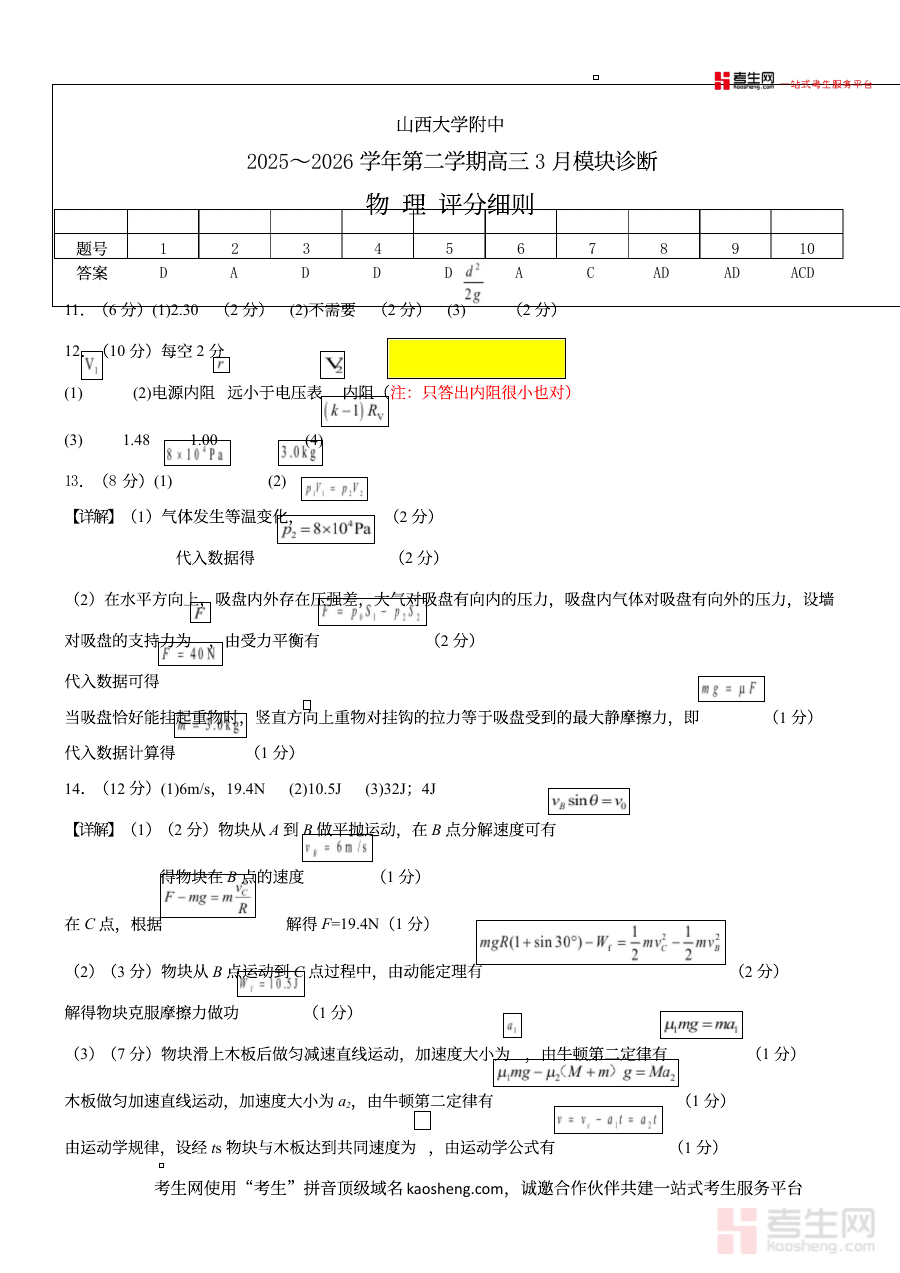 《山西大学附属中学校2026届高三3月月考物理试题 物理答案》是山西省太原市山西大学附属中学校针对2026届高三学生3月份物理月考推出的配套备考资料,包含该次校内月考物理试题的官方参考答案。作为高三下学期关键阶段的检测资料,它紧密贴合该校高三物理教学进度与阶段复习重点,为学生和教师提供了与校内考试直接对应的参考依据,能够有效反映阶段学习成果与教学效果。