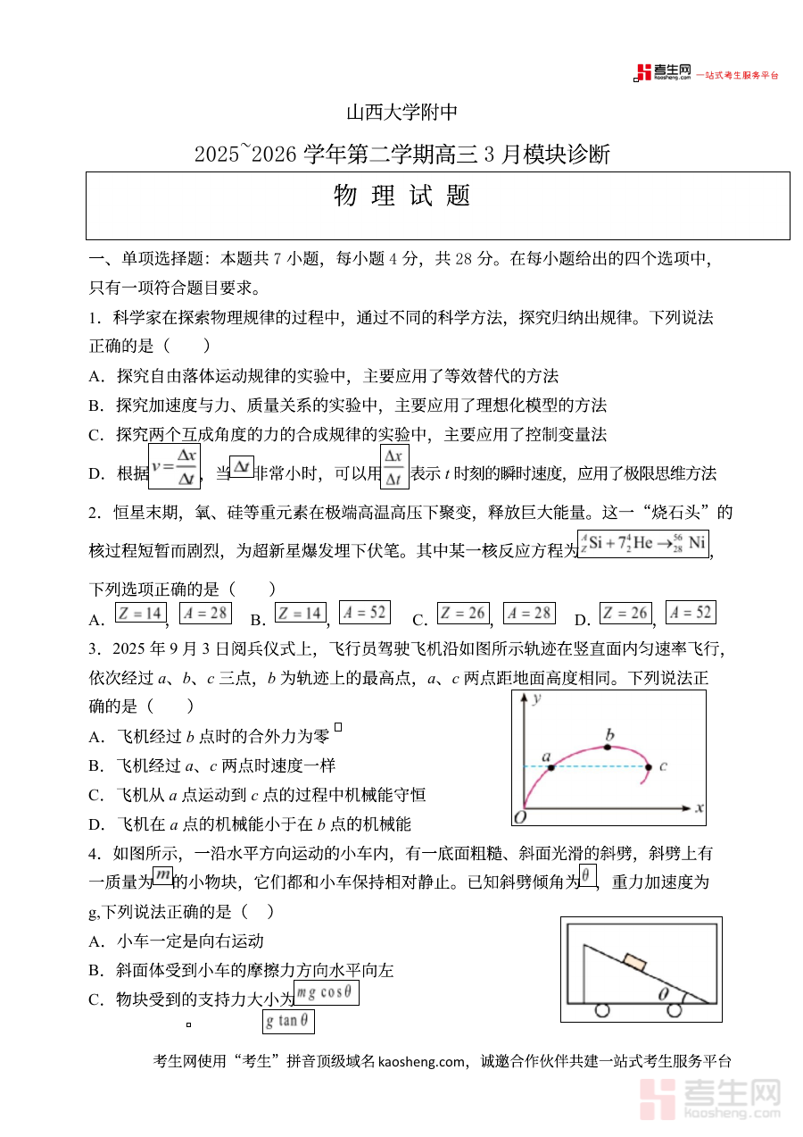 《山西大学附属中学校2026届高三3月月考物理试题 物理试题》是山西省太原市山西大学附属中学校针对2026届高三学生打造的春季学期3月份物理学科阶段性考试资料,属于高三备考过程中的重要月度检测素材。该试题紧密贴合2026届高三学生的复习进度,能够有效反映学生在该阶段对物理学科核心知识与技能的掌握情况,为师生了解备考状态、调整复习策略提供关键依据。