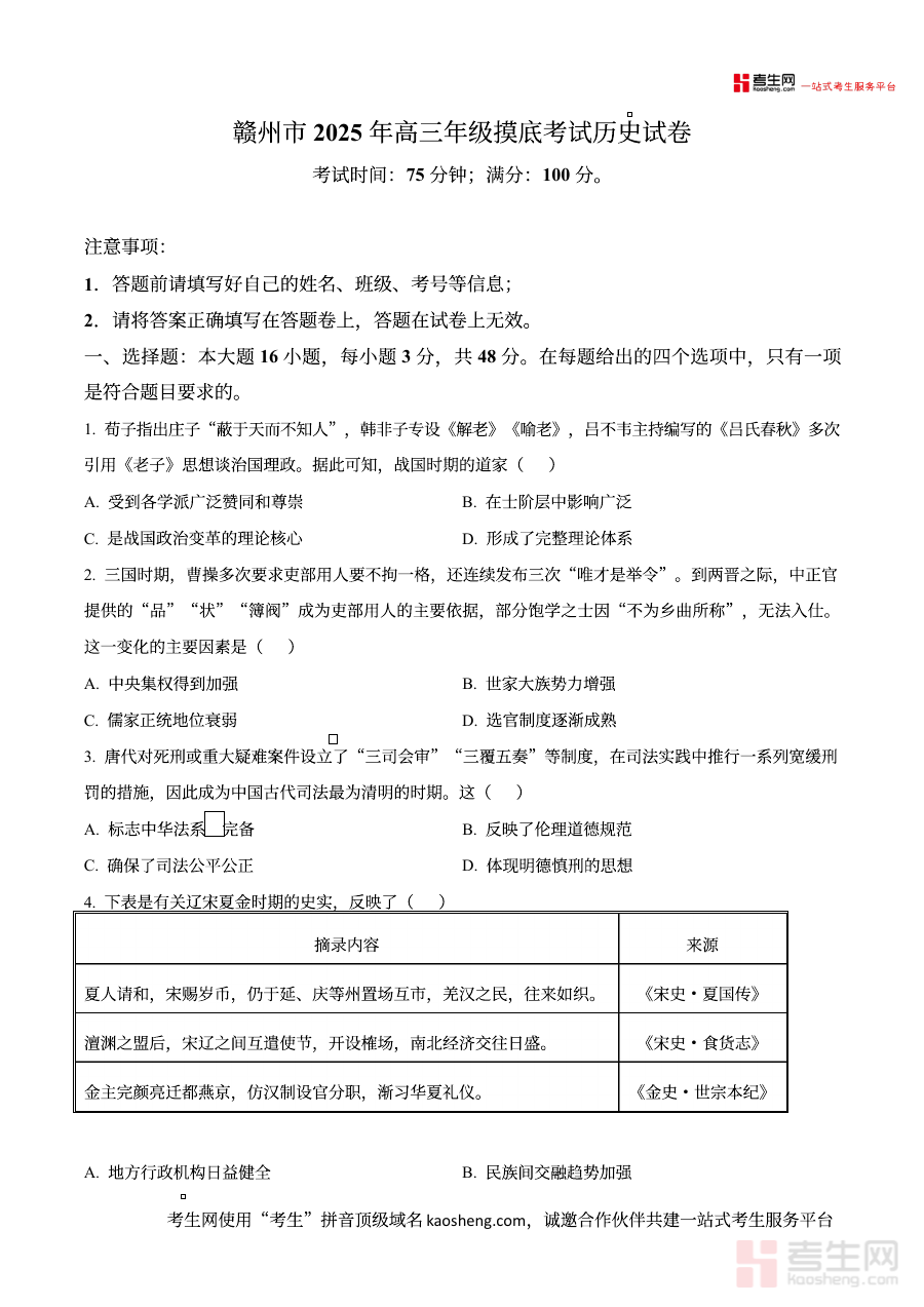 该资料主要适用于江西省赣州市参与本次联考的高三学生群体,也可作为其他希望参考同类地区联考模式进行历史学科备考的高三学生的辅助资料;通过使用这份原卷版试题,学生可进行针对性的自我检测,深入了解自身在历史学科各知识模块的掌握程度与应用能力,进而优化备考策略、提升复习效率;教师则可借助该试题分析区域内学生的整体学习状况,为集体教学安排与个性化指导方案的制定提供数据支持。