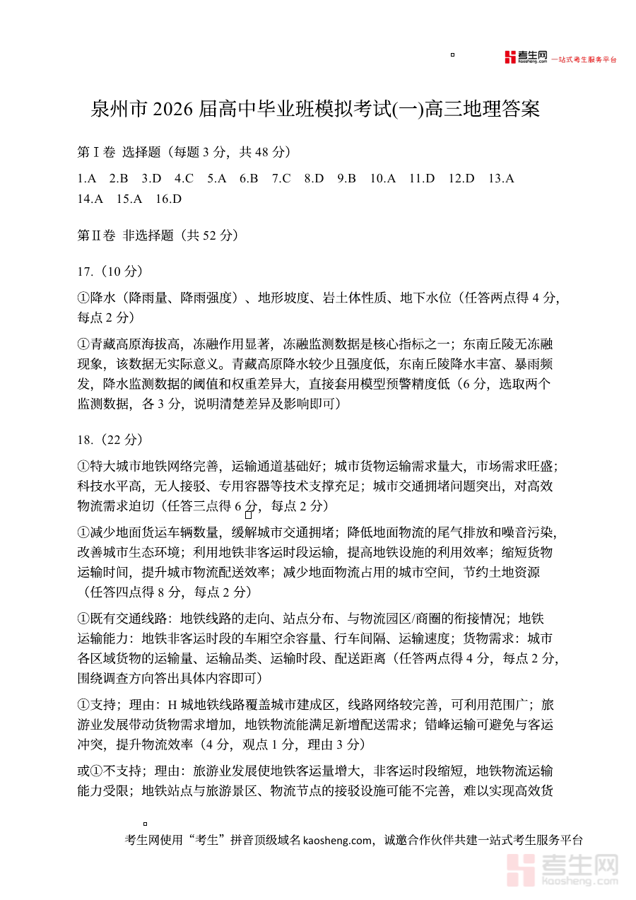 《泉州市2026届高中毕业班模拟考试(一)高三地理试题及答案 泉州市2026届高中毕业班模拟考试(一)高三地理试题答案》是泉州市针对2026届高中毕业班学生开展的首次模拟考试地理学科试题及配套答案集合,属于高三阶段核心备考资料。该资料立足本地高三地理教学进度与区域备考特点,为师生提供贴合本地教学实际的阶段性检测资源,是衔接日常复习与正式考试的重要桥梁。