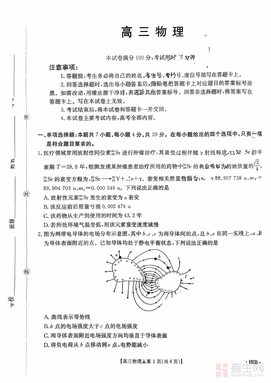 此试题资料的核心适用人群为2026届高三年级学生,特别是需要通过阶段性联考进行自我学习状态评估与备考方向梳理的学生群体。参与该联考测试,不仅能让学生直观了解自身物理学科的当前水平,还能通过联考的标准化检测训练提升应试技巧与时间管理能力,为后续高考物理备考阶段的系统复习与能力强化筑牢基础,助力学生在高考物理科目中取得理想成绩。