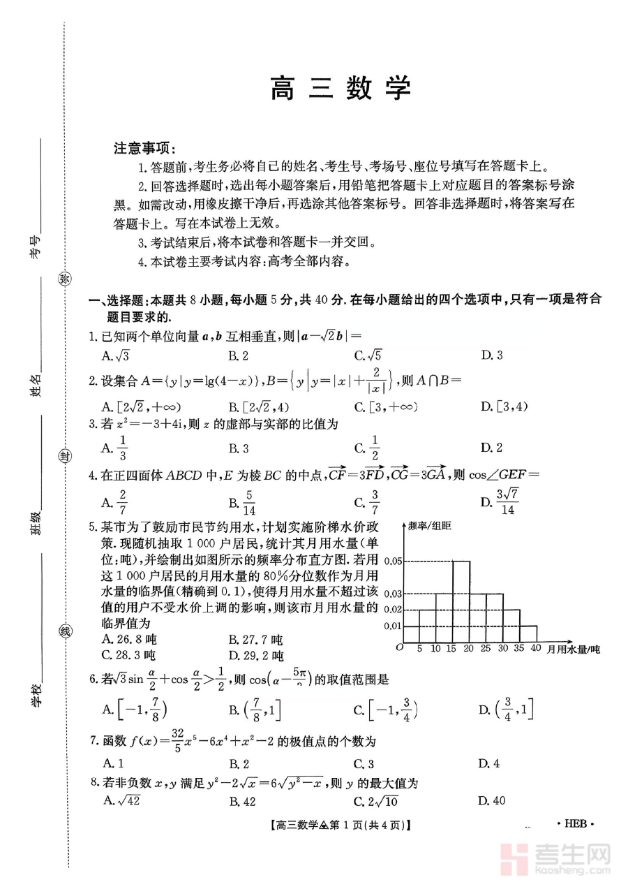 《河北省2026届高三上学期3月联考(26-313C)数学》是面向河北省2026届高三学生的数学学科阶段性备考资料,对应高三上学期3月举行的区域性联考。该联考作为高三中期重要的统一检测形式,能够客观反映河北省高三学生在该阶段数学学科的整体学习状况与个体水平差异,为后续复习提供基础参照。