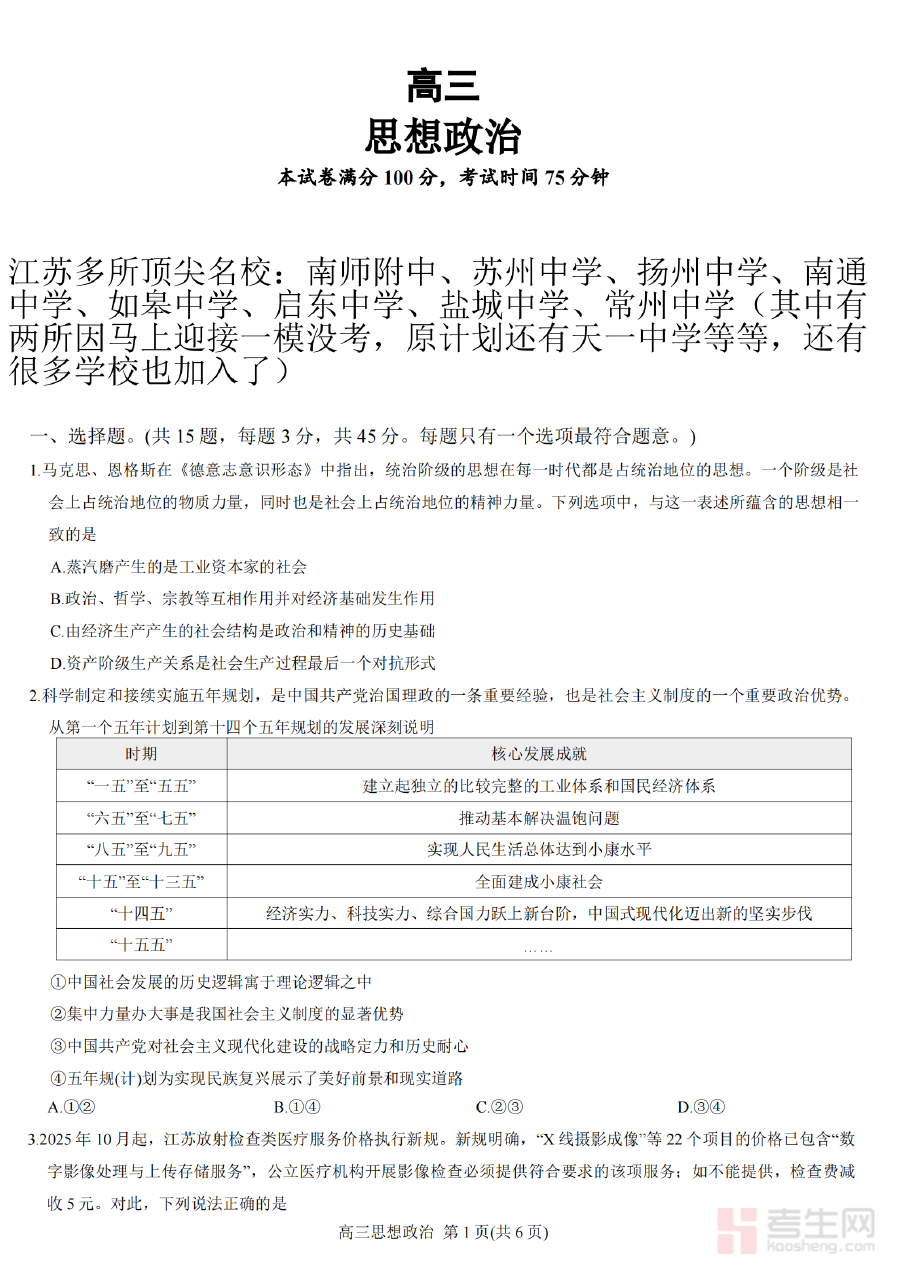 《江苏省九校2026届高三下学期3月联考 政治+答案》是针对江苏省内九所学校联合组织的2026届高三学生下学期3月阶段考试的政治学科备考资料。该资料包含考试原题及对应的参考答案,聚焦高三下学期关键备考阶段的联考需求,贴合江苏地区高中政治教学实际与九校联考的命题方向,为学生和教师提供了具有区域针对性和阶段适配性的参考素材。