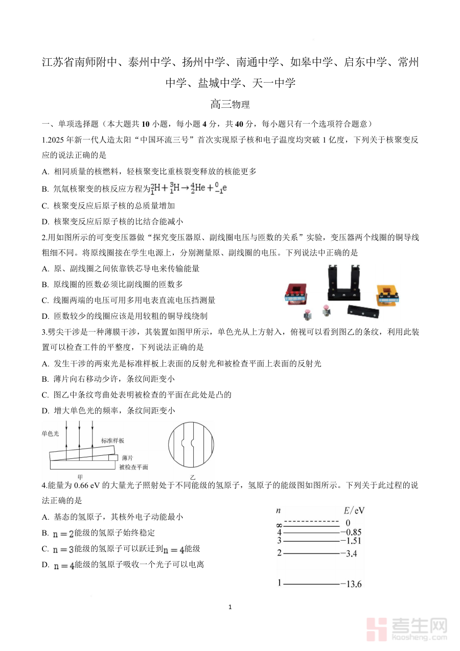 它适用于江苏省2026届高三学生,尤其是参与本次九校联考的学生群体,同时也可为物理学科教师提供区域化的教学参考素材。其包含的答案部分能帮助学生快速核对作答情况,提升自主学习的效率,是高三下学期物理学科阶段检测与备考规划的重要辅助资源,对学生巩固知识体系、提升应试能力具有积极意义,能让师生更清晰地把握备考方向。