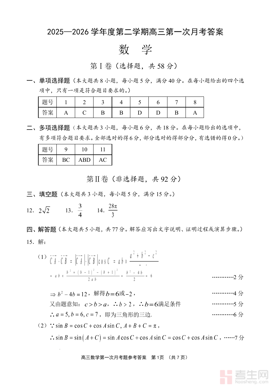 《文昌中学2025一2026学年度第二学期高三第一次月考试题 数学答案》是文昌中学在2025至2026学年第二学期针对高三年级组织的第一次月考数学科目的配套答案资料,属于高三阶段关键的阶段性备考辅助材料,与该次月考的试题内容高度匹配,为考生和教学人员提供了清晰的作答参考标准。