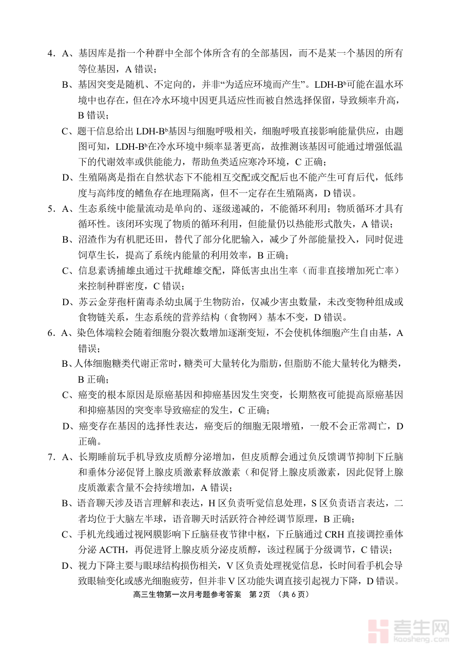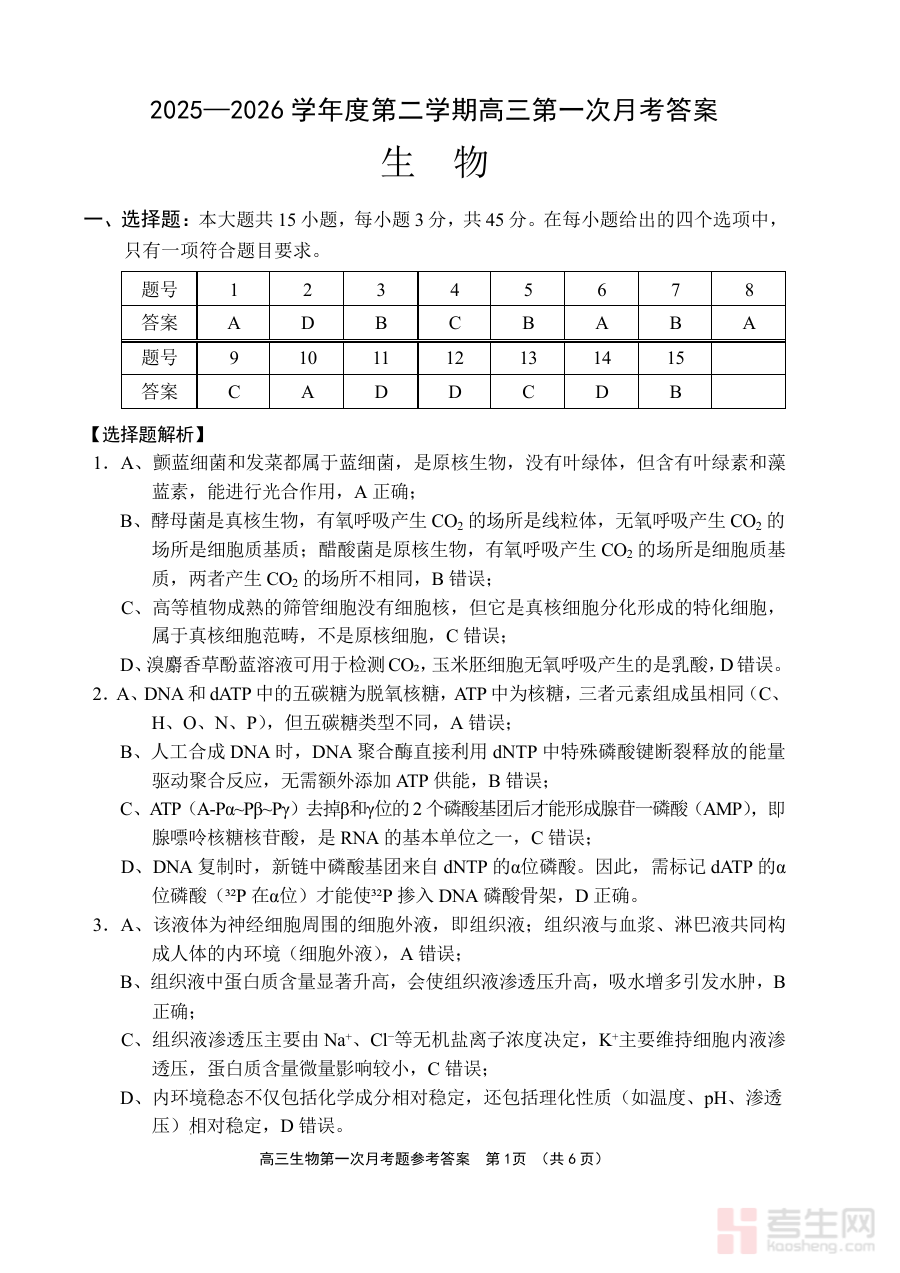 《文昌中学2025一2026学年度第二学期高三第一次月考试题 生物答案》是针对文昌中学2025至2026学年第二学期高三阶段第一次月度考试的生物学科配套答案资料,属于高三年级生物学科阶段性考试的辅助备考资源,能够为相关考试的结果验证提供直接依据。