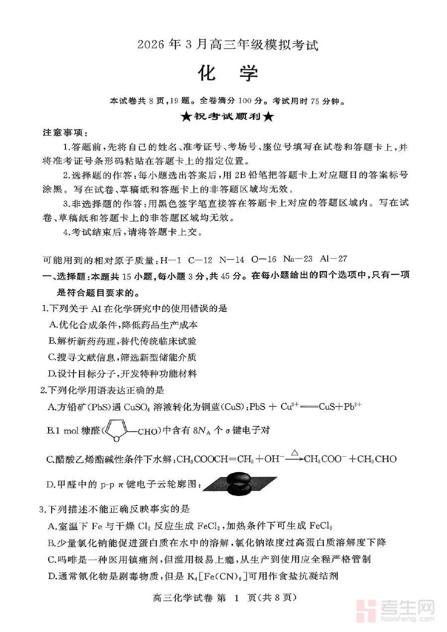 《湖北黄冈2026届高三下学期3月模考(二模)化学试卷》是湖北黄冈地区针对2026届高三学生在第二学期3月开展的第二次模拟考试的化学学科专用试卷,属于高三高考复习阶段的重要备考资料。该试卷紧密贴合当地高三化学教学进度与高考备考节奏,旨在通过标准化的模拟考试形式,为学生提供与高考化学考试要求相匹配的练习载体,助力学生熟悉区域模考的命题风格与考查方向。