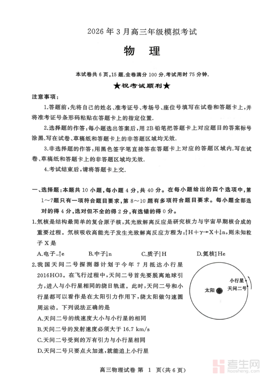 《物理试卷-2026年3月黄冈市高三年级3月模拟考试》是2026年3月由黄冈市针对本地高三年级学生组织的物理学科模拟考试专用资料,属于区域性阶段性高考备考资源。它严格遵循当地高三物理教学大纲与高考命题趋势,能够为考生营造贴近真实高考的测试环境,帮助考生提前适应考试节奏与题型特点,为后续的系统复习奠定基础。