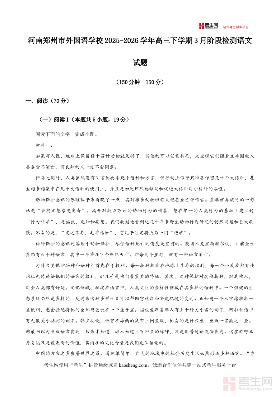 《河南郑州市外国语学校2025-2026学年高三下学期3月阶段检测语文试题(解析版)》是河南郑州地区郑州市外国语学校针对2025-2026学年高三下学期学生设计的阶段性语文检测资料,包含完整试题及配套解析内容,属于高三关键备考阶段的重要学习资源,能够精准反映该校在高三下学期3月节点对学生语文知识掌握程度与综合应用能力的考察重点和方向。