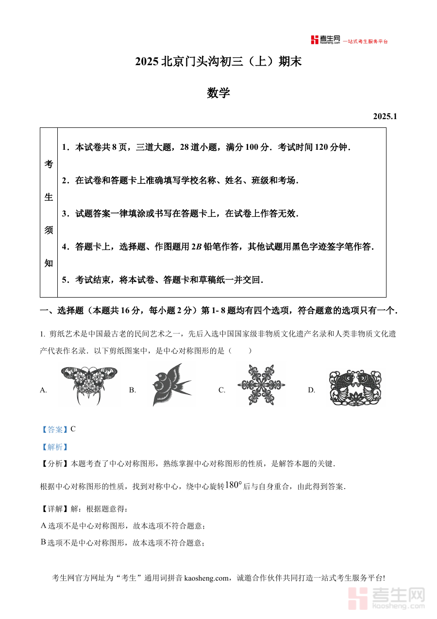 本资料适用于北京市门头沟区2024-2025学年九年级学生,也可作为教师开展期末复习指导的参考工具,其解析内容有助于学生巩固上学期所学知识,提升应对期末考试的能力,同时为教师了解本地考试趋势、优化教学策略提供支持。