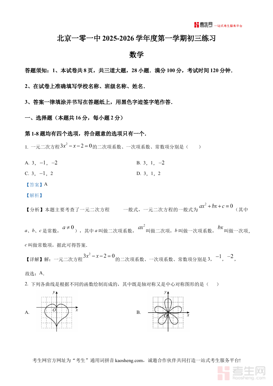 《精品解析:北京一零一中2025-2026学年九年级上学期9月月考数学试题(解析版)》是针对北京一零一中特定学年九年级上学期9月数学月考的专项备考资料,其核心元信息明确指向2025-2026学年、北京地区、校级九年级上学期9月月考这一特定考试场景,为对应阶段的数学学习提供精准的参考依据,帮助使用者快速定位该考试的核心考察方向与阶段学习重点。
