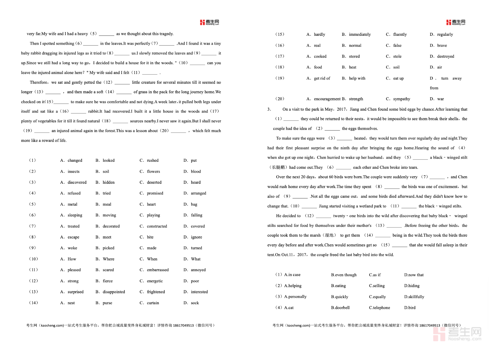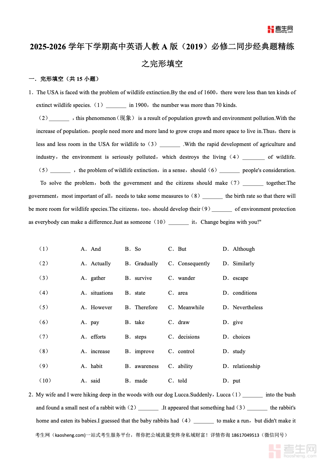 2025-2026 学年下学期高中英语人教 A 版(2019)必修二同步经典题精练之完形填空紧扣教材单元话题与高考命题思路,精选难度适配的语篇材料,聚焦词汇辨析、固定搭配、逻辑衔接、语境推理四大核心考点,涵盖记叙文、说明文等常考文体。题目注重语篇理解、上下文推断、情感态度判断、易错选项区分,循序渐进提升解题能力。内容同步教学进度,贴合高一学情,既巩固单元知识,又培养完形答题思维。适合高一学生同步训练、专题突破、单元检测、考前刷题,快速提高完形填空正确率与应试水平。请添加微信 18617049513 进专属群,获取更多免费资源