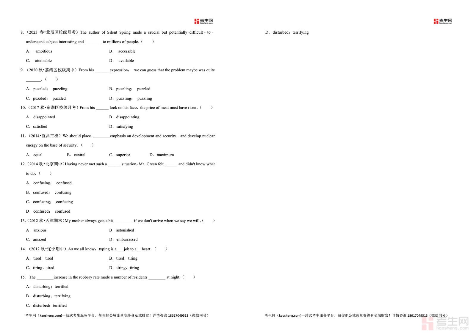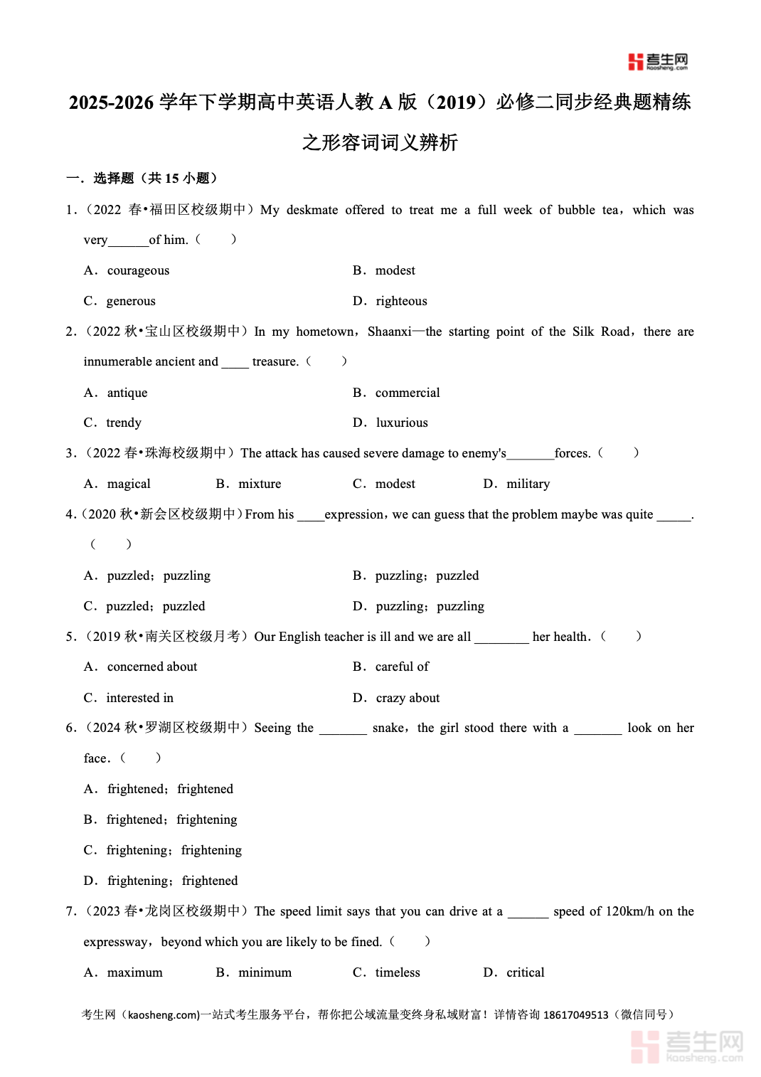 2025-2026 学年下学期高中英语人教 A 版(2019)必修二同步经典题精练之形容词词义辨析紧扣教材单元词汇与高考考向,针对必修二核心形容词展开专项训练,聚焦近义形容词区分、语境情感判断、固定搭配使用、易混词汇辨析等高频考点,精选典型习题覆盖单项选择、语法填空、完形填空等常考题型。内容侧重语境理解、词义对比、用法归纳、易错点突破,帮助学生精准把握形容词使用场景,提升词汇运用能力。适合高一学生同步巩固、词汇专题训练、单元复习、考前查漏补缺,夯实词汇基础并提高应试得分能力。请添加微信 18617049513 进专属群,获取更多免费资源