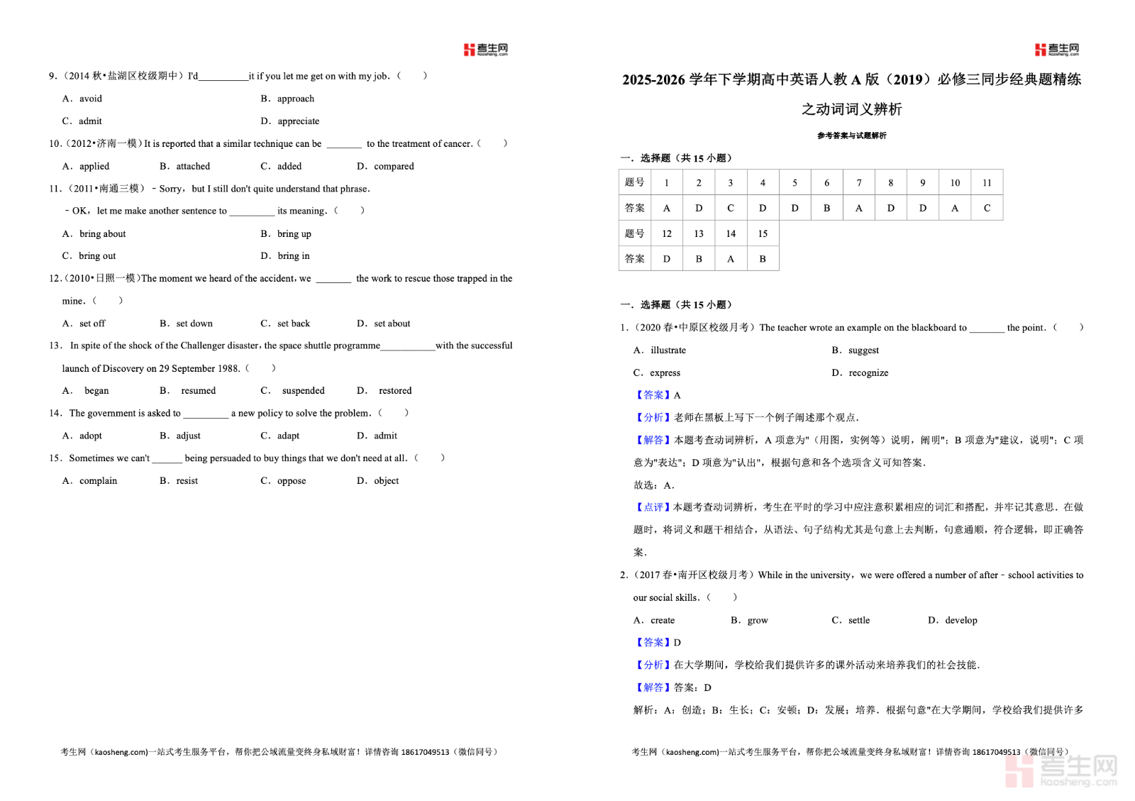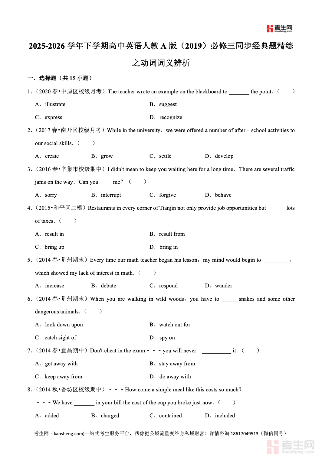 2025-2026 学年下学期高中英语人教 A 版(2019)必修三同步经典题精练之动词词义辨析紧扣教材单元核心词汇与高考考查方向,针对必修三高频易混动词展开专项练习,重点突破近义动词区分、固定搭配运用、语境语义判断、时态语态结合等关键考点,精选语法填空、完形填空、单项选择等经典题型,注重语境理解、用法对比、易错点归纳、解题思路梳理,帮助学生精准掌握动词用法。资料同步教学进度,难度适配高一学生,适合课后同步巩固、词汇专项提升、单元复习检测、考前强化训练,有效提高词汇辨析与应试得分能力。请添加微信 18617049513 进专属群,获取更多免费资源