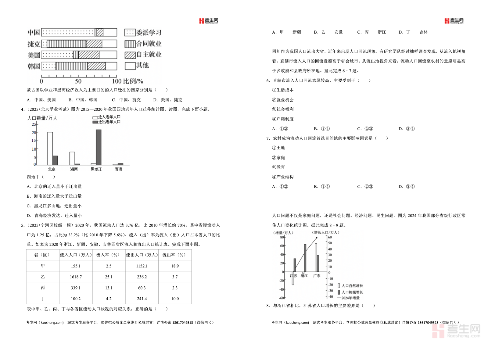 2025—2026 学年下学期高一地理鲁教版(2019)同步经典题精练之人口迁移,严格同步教材章节内容与高一下学期教学进度,聚焦人口迁移概念、影响因素、推拉理论、人口迁移对区域发展的影响等核心考点,精选基础巩固、能力提升、易错辨析等分层习题,注重图表判读、案例分析、区域对比、逻辑推理能力训练,贴合新课标与高考命题趋势。内容紧扣课堂知识点,帮助学生理清人口迁移的内在逻辑,强化知识应用能力。适合高一学生课后同步练习、章节复习、专题巩固、考前查漏补缺,快速提升人口迁移相关内容的理解与应试解题能力。请添加微信 18617049513 进专属群,获取更多免费资源