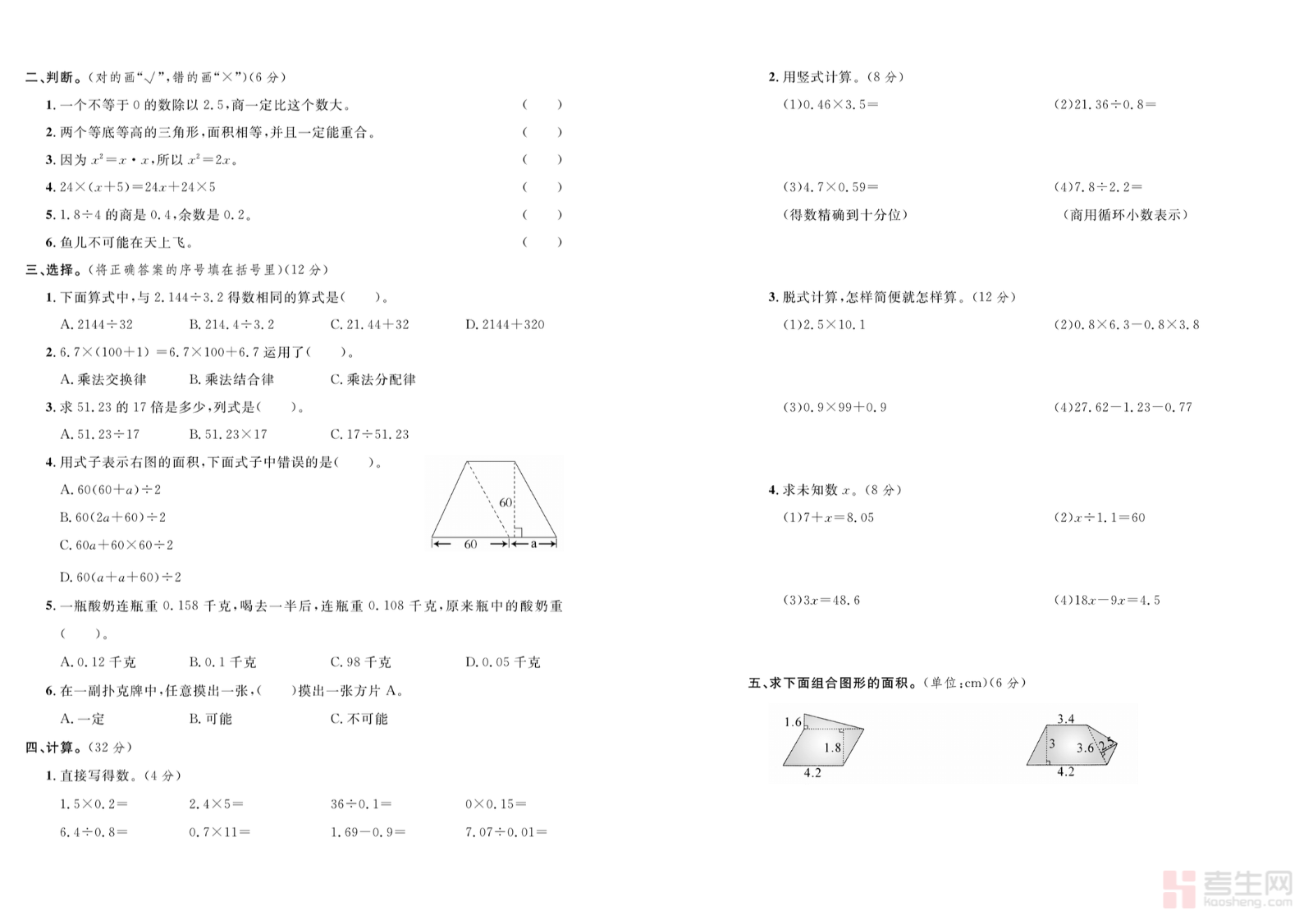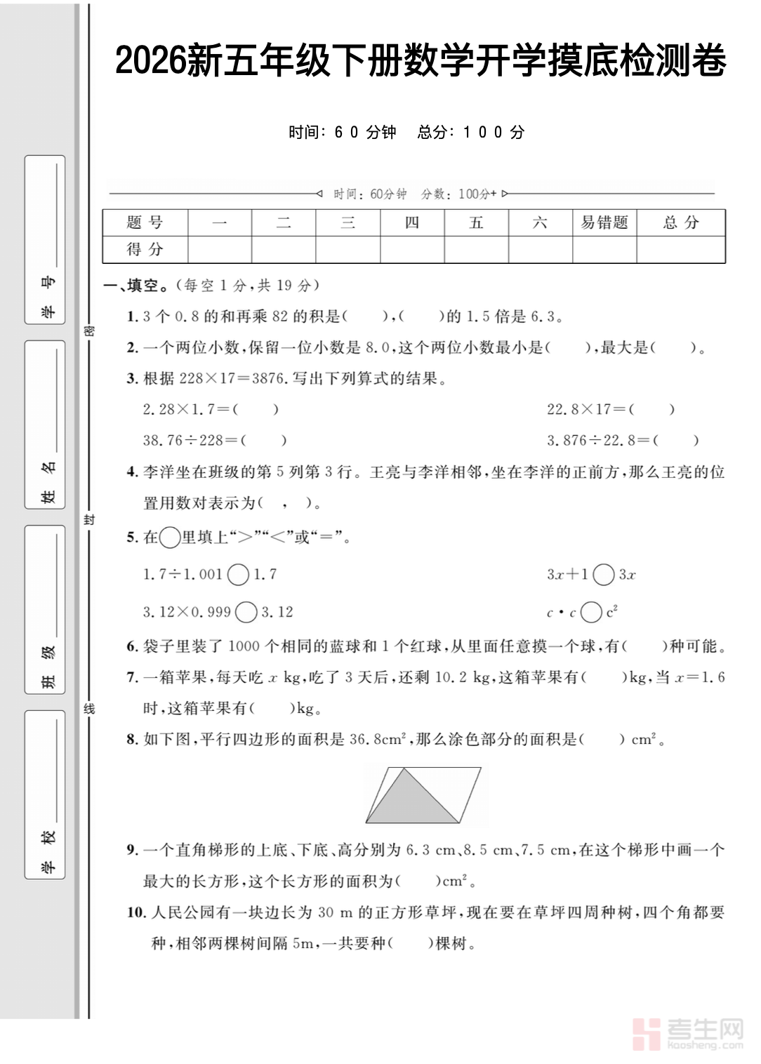小学数学开学摸底检测卷五年级下册依据五年级上册重点知识与下册衔接考点编写,全面覆盖小数运算、因数与倍数、长方体正方体、分数意义与性质、简单统计与解决问题等核心内容,题型包含填空、判断、选择、计算、操作题和应用题,难度适中贴合五年级学情,侧重基础夯实、易错点排查、知识衔接、综合运用,既能精准检测假期知识掌握情况,又能帮助学生快速调整学习状态,明确薄弱环节。试卷结构规范、考点全面,适合五年级学生开学自测、课堂检测、查漏补缺、预习铺垫,为新学期数学学习筑牢基础。请添加微信 18617049513 进专属群,获取更多免费资源