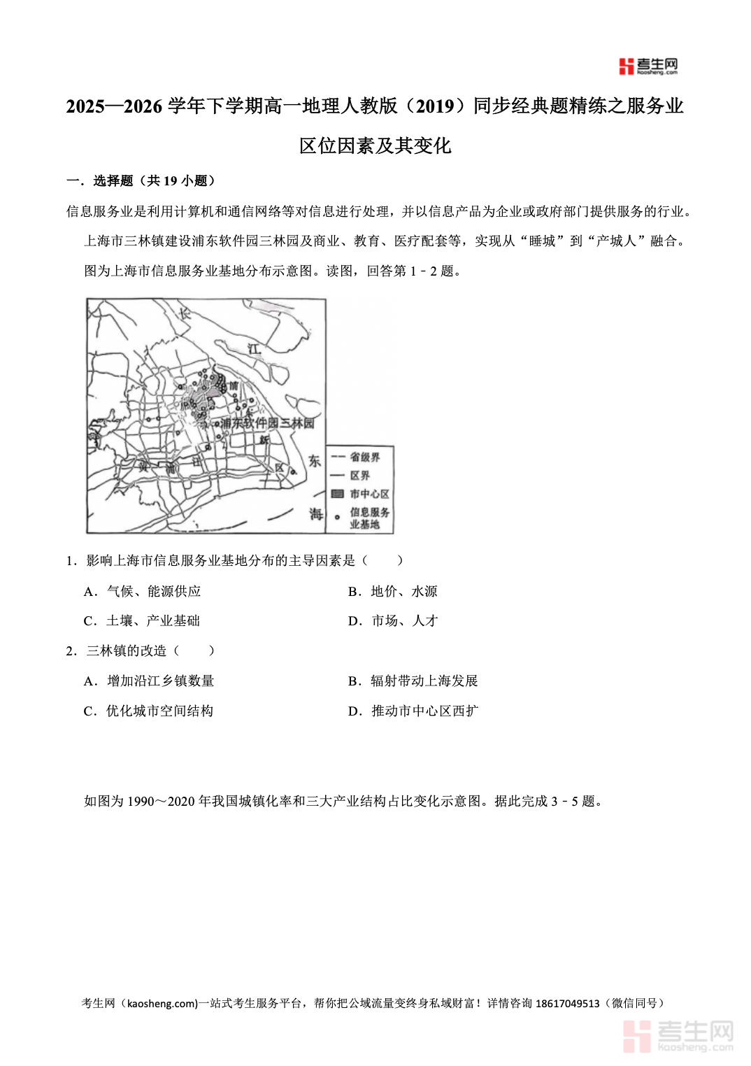 2025—2026 学年下学期高一地理人教版(2019)同步经典题精练之服务业区位因素及其变化,同步高一下学期教学进度与教材章节,围绕服务业区位因素、服务业布局特点、区位因素的时代变化、数字化对服务业的影响等核心考点展开,精选典型基础题与综合应用题,强化图表分析、材料解读、案例运用、答题规范训练,贴合新课标与高考命题思路,帮助学生理清知识逻辑、突破易错难点。适合高一学生同步练习、课后巩固、专题复习、考前刷题,快速夯实地理基础,提升区位分析与综合解题能力。请添加微信 18617049513 进专属群,获取更多免费资源