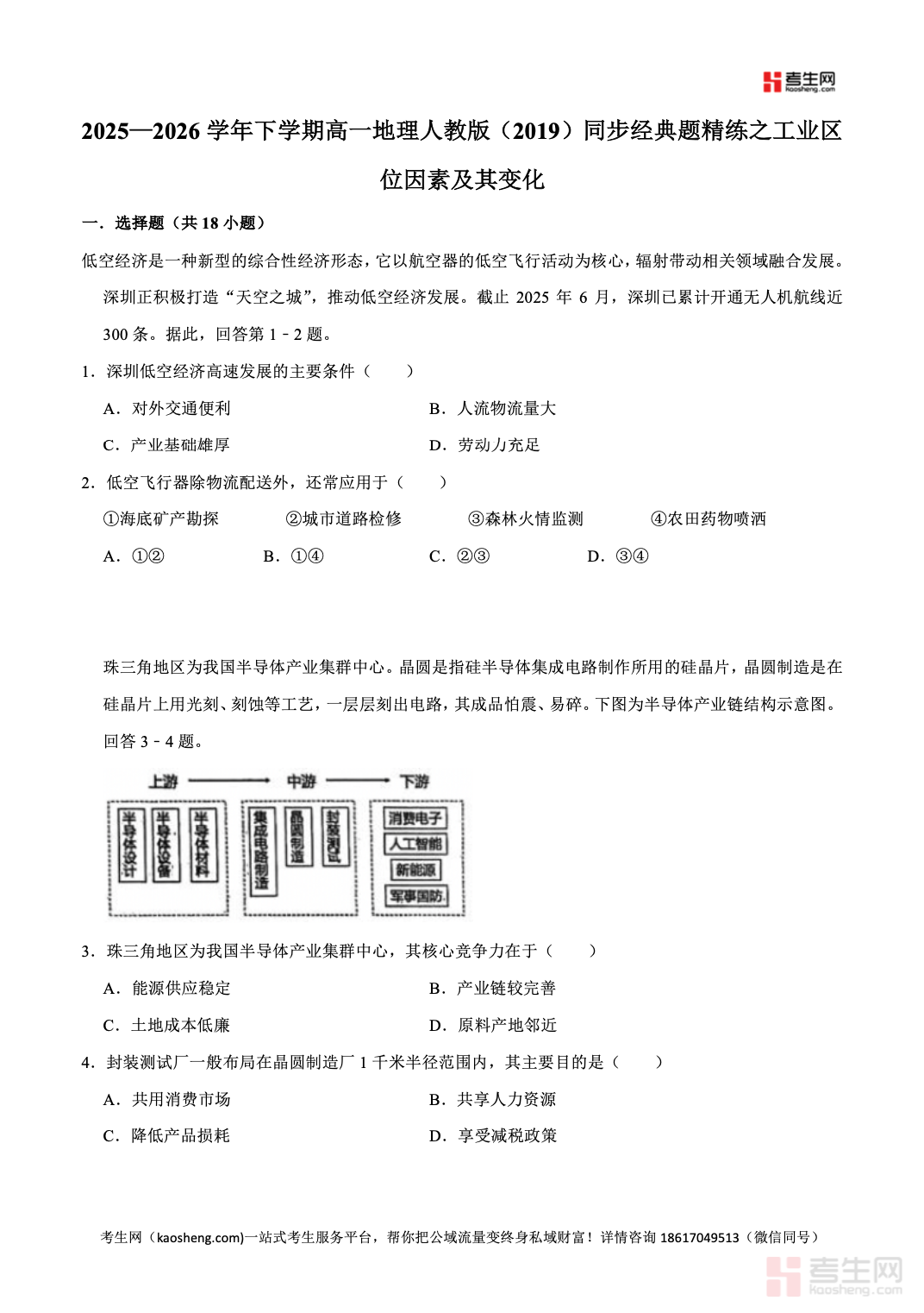2025—2026 学年下学期高一地理人教版(2019)同步经典题精练之工业区位因素及其变化,同步高一下学期教学进度与教材章节,围绕工业区位因素、工业区位导向类型、区位因素的动态变化、工业集聚与分散等核心考点设计练习,覆盖传统工业与新兴工业的区位分析等重点内容。精选基础巩固、能力提升、易错辨析等分层习题,注重图表判读、案例应用、区位分析、综合探究训练,精准对接高考考向,帮助学生掌握工业区位选择的思路与方法,理清区位因素变化对工业布局的影响。适合高一学生同步练习、专题突破、课后巩固、单元复习,快速夯实章节基础,提升地理综合分析与应试解题能力。请添加微信 18617049513 进专属群,获取更多免费资源