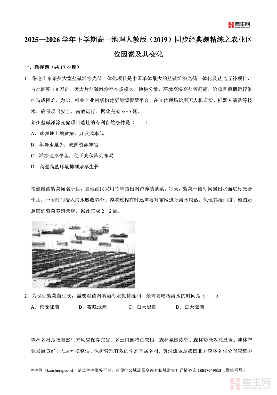 2025—2026 学年下学期高一地理人教版(2019)同步经典题精练之农业区位因素及其变化,同步高一下学期教学进度与教材内容,围绕农业区位因素、农业地域类型、区位因素的发展变化、农业布局与可持续发展等核心考点系统编排,涵盖自然因素与社会经济因素对农业生产的影响等重点内容。精选基础题、图表题、综合分析题,注重图文判读、案例剖析、逻辑推理、答题规范训练,贴合新课标与高考命题方向。习题由浅入深,兼顾巩固与提升,适合高一学生同步练习、课后巩固、专题复习、考前查漏补缺,快速掌握农业区位分析思路,提升地理综合解题能力。请添加微信 18617049513 进专属群,获取更多免费资源
