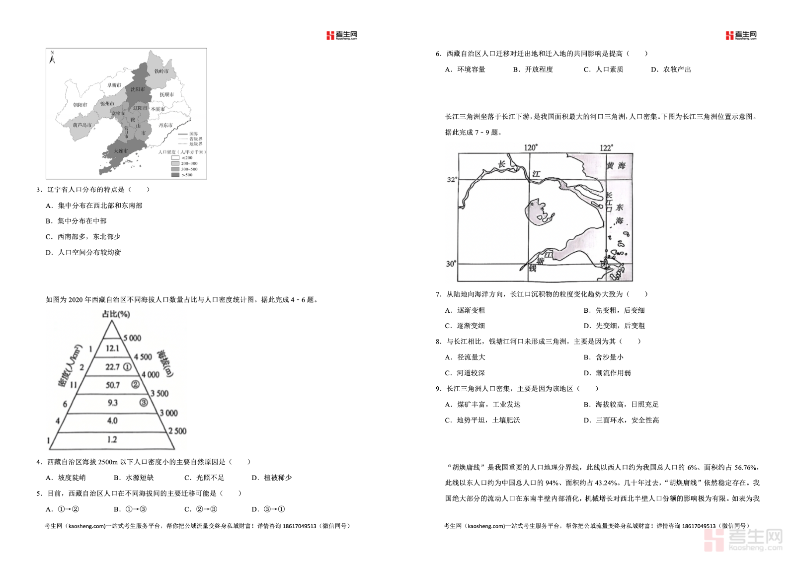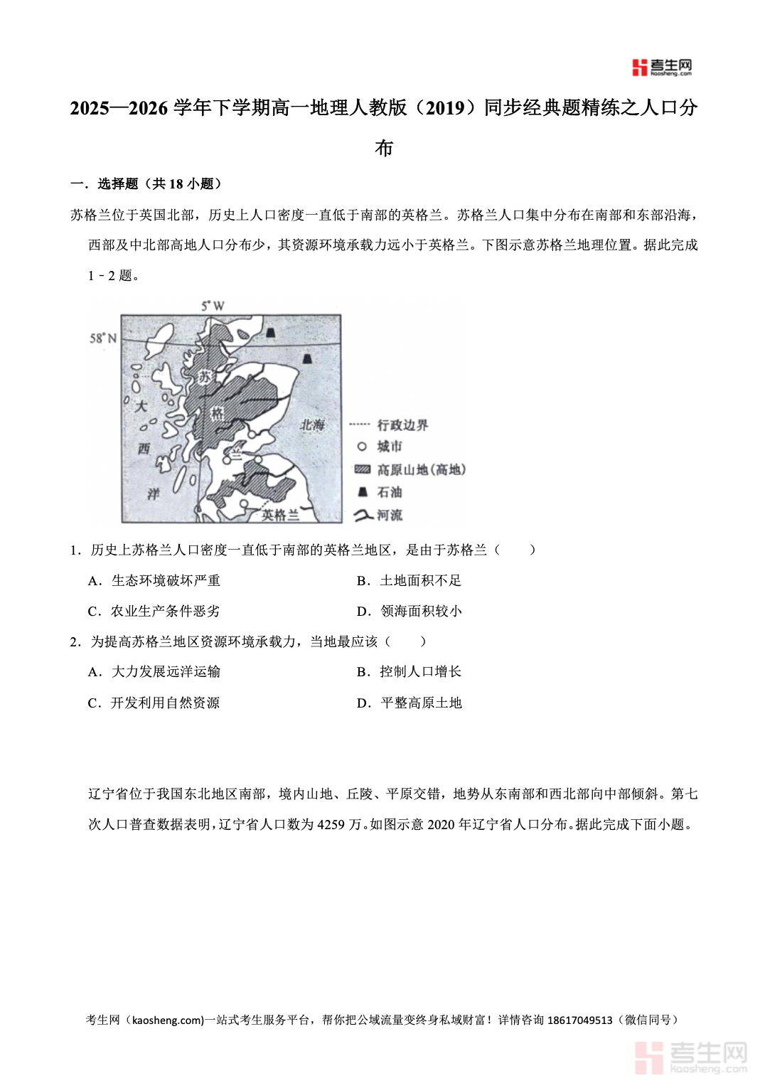 2025—2026 学年下学期高一地理人教版(2019)同步经典题精练之人口分布,同步高一下学期教学进度与教材知识点,围绕世界人口分布特点、我国人口分布格局、影响人口分布的自然因素与社会经济因素、人口分布与地理环境的关系等核心考点展开练习,题型涵盖基础判断、图表分析、综合问答等,注重读图析图、区域对比、材料分析、逻辑表达能力训练,贴合新课标与高考命题趋势。习题难度适中、考点全面,可有效巩固课堂知识,强化区域认知与综合思维。适合高一学生课后同步练习、章节复习、专题巩固、考前自测查漏补缺,快速提升人口相关内容的理解与解题能力。请添加微信 18617049513 进专属群,获取更多免费资源