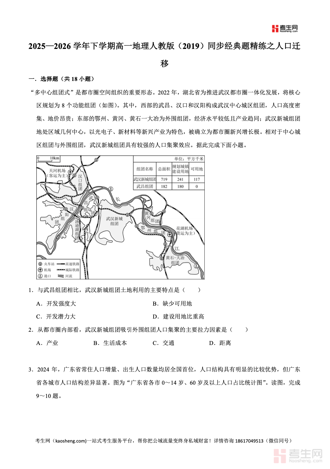 2025—2026 学年下学期高一地理人教版(2019)同步经典题精练之人口迁移,同步教学进度与教材考点,围绕人口迁移概念与分类、影响人口迁移的推拉因素、国际国内人口迁移特点、人口迁移对迁入地与迁出地的影响等核心内容展开,题型包含选择题、图表分析题、综合简答题,注重图表判读、材料分析、逻辑推理、规范答题训练,贴合新课标要求与高考命题方向。习题梯度清晰,兼顾基础巩固与能力提升,能有效帮助学生梳理知识脉络、突破易错难点。适合高一学生课后同步练习、章节复习、专题巩固、考前自测,扎实掌握人口迁移相关考点,提升地理综合解题能力。请添加微信 18617049513 进专属群,获取更多免费资源