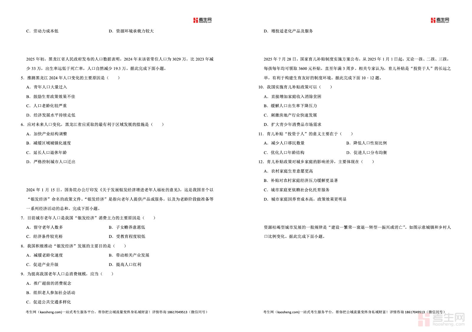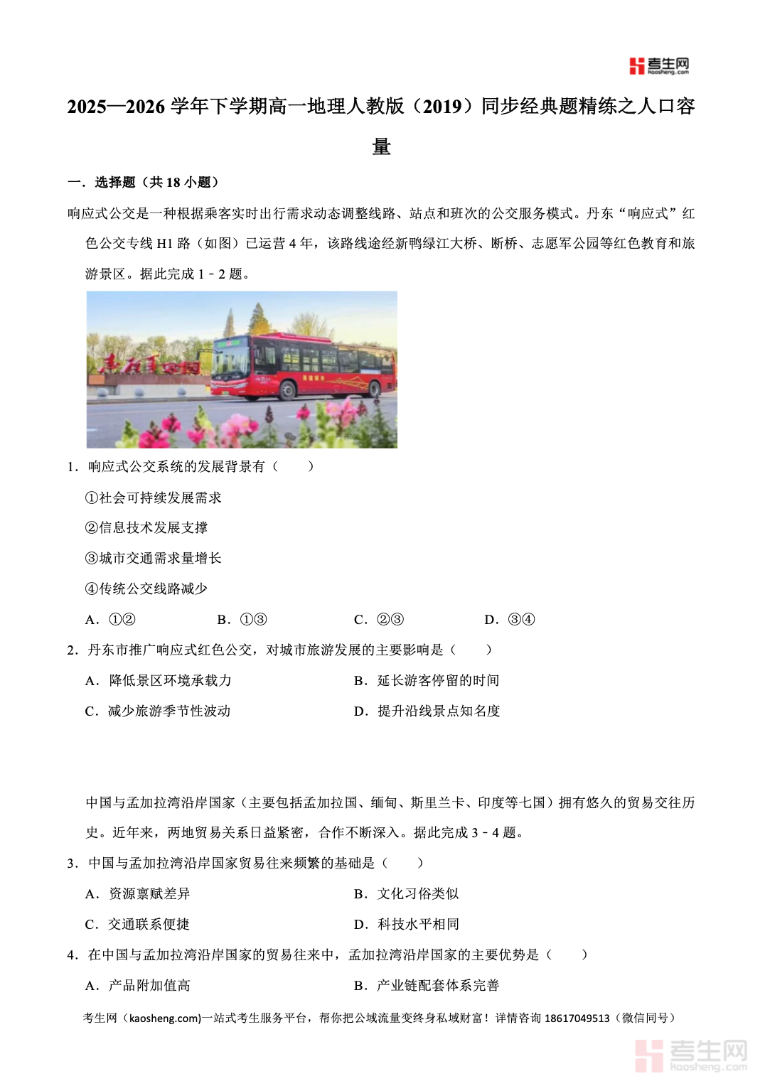 2025—2026 学年下学期高一地理人教版(2019)同步经典题精练之人口容量,同步高一下学期教学进度,紧扣区域资源环境承载力、人口合理容量、影响人口容量的因素、人口与资源环境协调发展等核心考点,精选基础题、图表分析题与综合应用题,强化概念辨析、材料解读、图文分析、逻辑推理能力训练,贴合新课标与高考命题思路,帮助学生厘清易混概念、构建知识体系。习题难度循序渐进,考点覆盖全面,适合高一学生课后同步练习、章节巩固、专题复习、考前自测查漏补缺,快速提升对人口容量相关知识的理解与解题能力。请添加微信 18617049513 进专属群,获取更多免费资源
