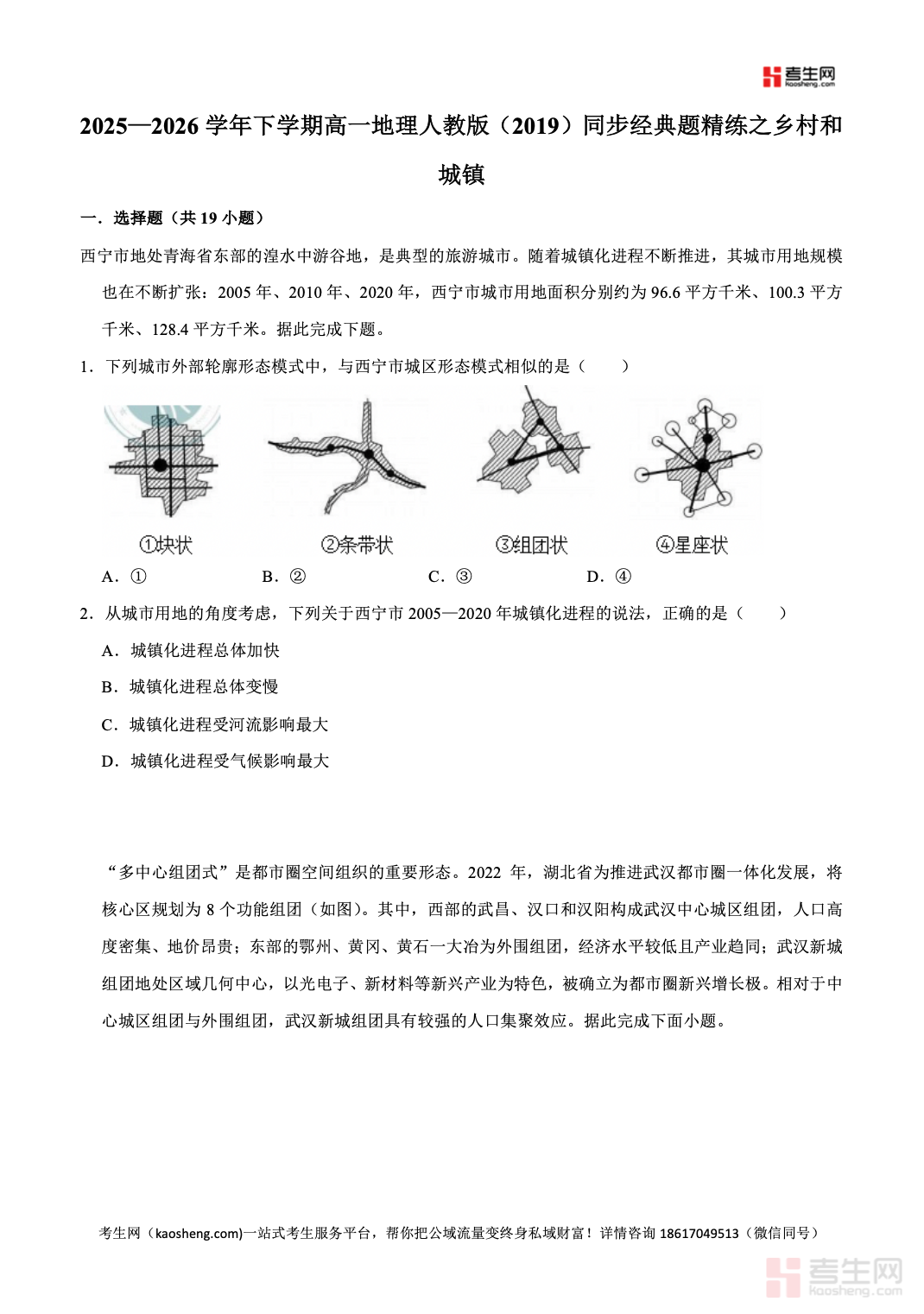 2025—2026 学年下学期高一地理人教版(2019)同步经典题精练之乡村和城镇,同步教材章节与教学进度,围绕乡村城镇空间结构、城镇化进程、城镇化问题与治理、地域文化与城乡景观等核心考点设计习题,覆盖城乡内部空间布局、城镇化特征及区域差异等重点内容,题型包含选择、图表分析、综合探究等,注重图文判读、区位分析、问题探究、答题规范训练,贴合新课标与高考命题方向。习题由基础到提升层层递进,帮助学生梳理知识、突破易错点,适合高一学生课后同步练习、章节复习、专题巩固、考前自测,扎实掌握城乡相关考点,提升地理综合思维与解题能力。请添加微信 18617049513 进专属群,获取更多免费资源