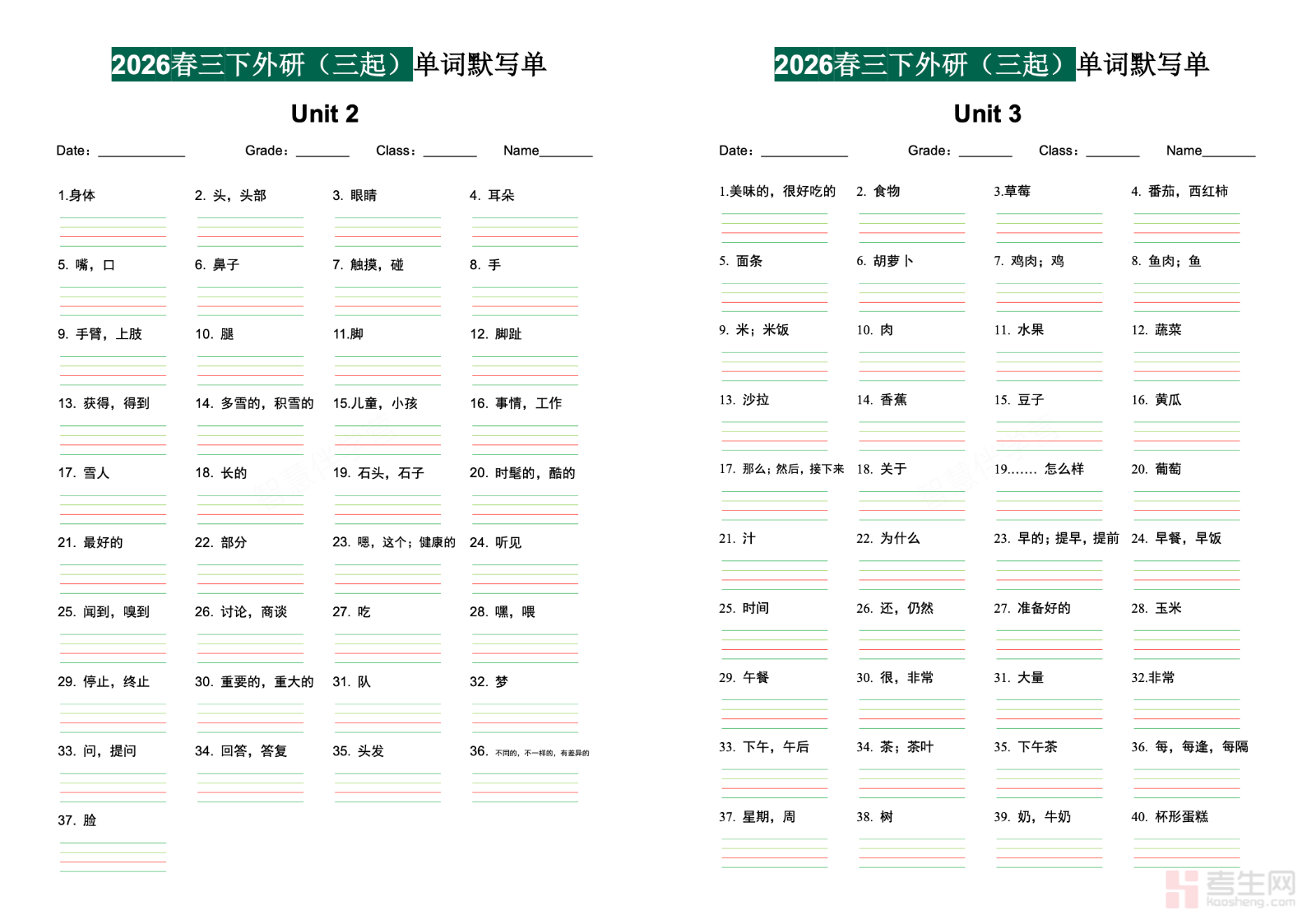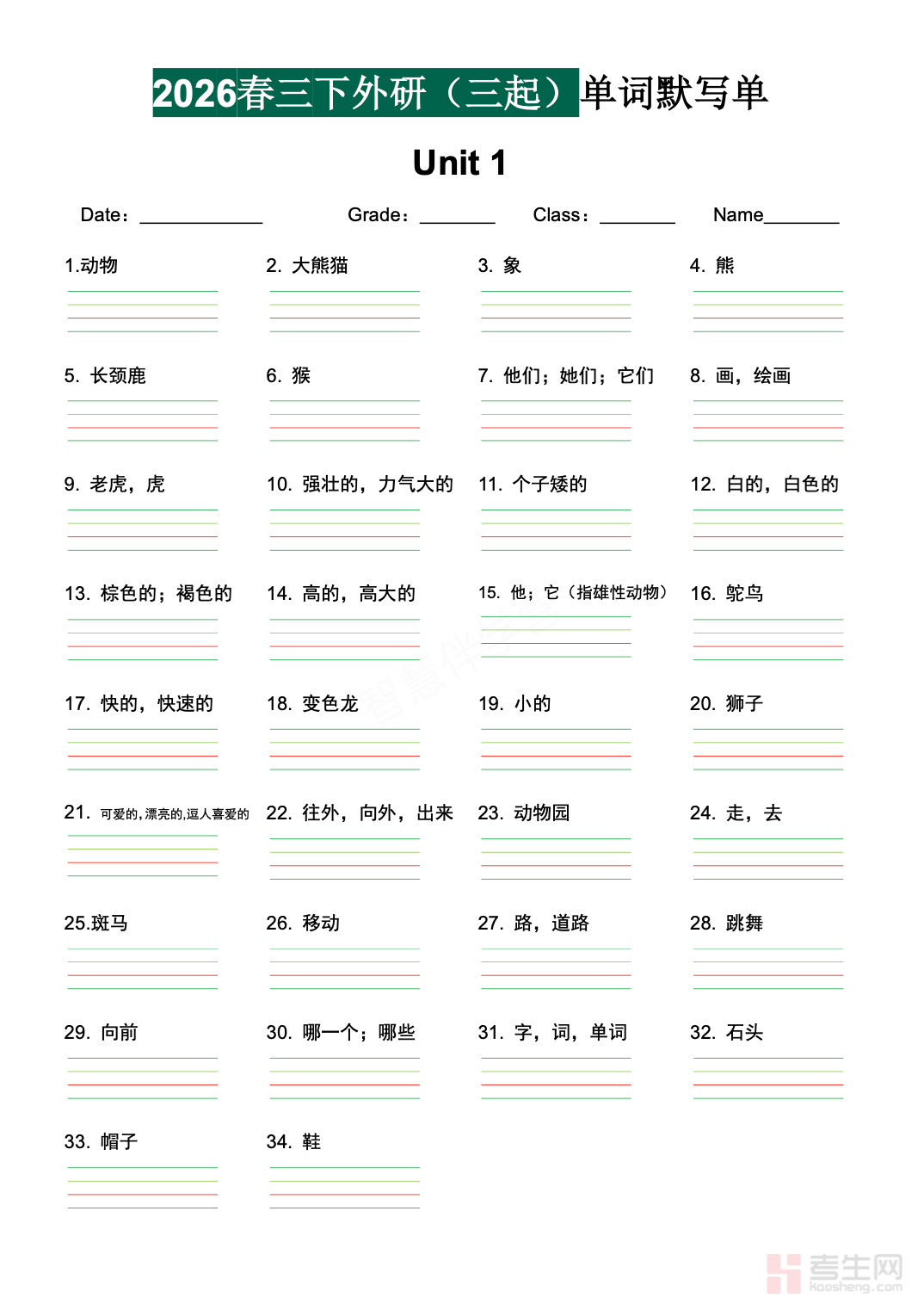 小学英语单词默写单外研版三起三年级下册同步教材单元内容编排,全面收录本册基础入门单词、颜色动物类词汇、日常交际常用词,采用英汉对照默写形式,排版清晰易书写,适合刚接触英语的低年级学生使用,侧重单词认读、规范拼写、英汉互译、基础记忆训练,贴合小学低年级英语教学目标与课堂听写要求。内容简单易懂、难度循序渐进,可用于课前预习、课堂听写、课后巩固、单元小测、亲子辅导,帮助孩子快速打好英语词汇基础,培养良好的单词记忆与书写习惯,为后续英语学习筑牢根基。请添加微信 18617049513 进专属群,获取更多免费资源!