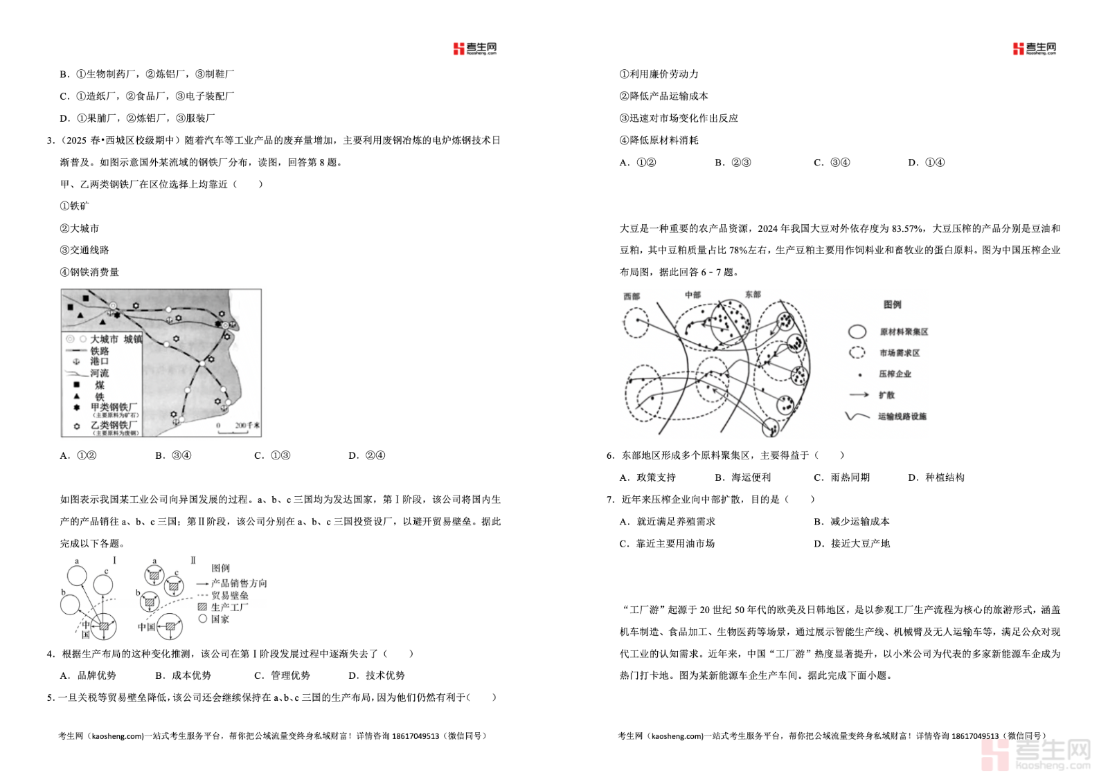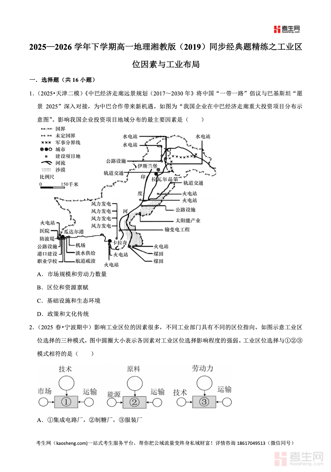 2025—2026 学年下学期高一地理湘教版(2019)同步经典题精练之工业区位因素与工业布局,同步教材教学进度,聚焦工业区位因素、工业导向类型、工业集聚与分散、工业布局原则、区域工业可持续发展等核心考点,精选基础题、图表题与综合应用题,强化图表判读、材料分析、区位论证、规范答题能力训练,贴合新课标与高考考向。习题由浅入深、考点全面,助力学生理清工业布局逻辑,突破易错易混点。适合高一学生同步练习、课后巩固、专题突破、单元复习与考前自测,快速提升工业区位相关的解题能力与地理综合思维。请添加微信 18617049513 进专属群,获取更多免费资源!