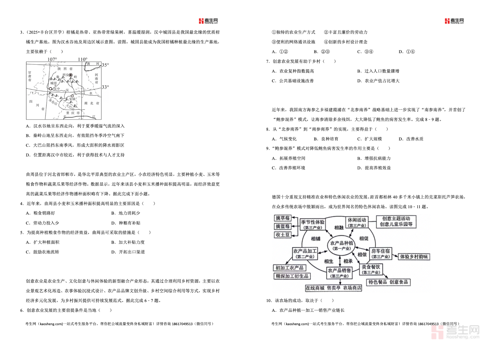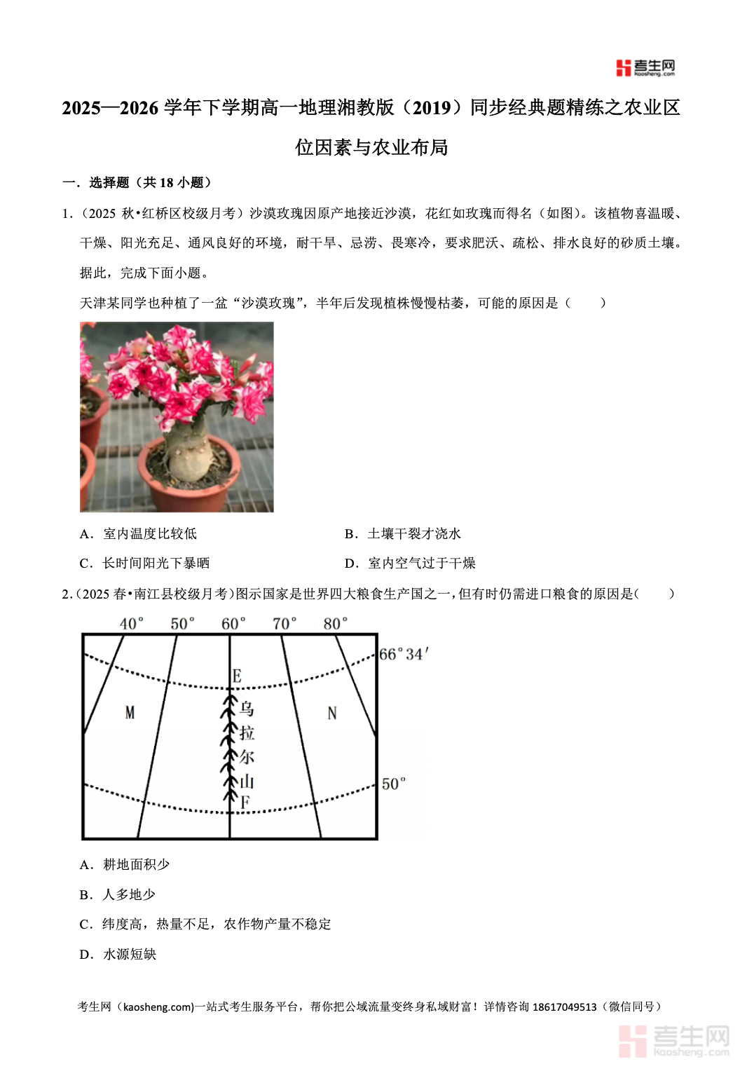 2025—2026 学年下学期高一地理湘教版(2019)同步经典题精练之农业区位因素与农业布局,同步教材教学进度,紧扣农业区位因素、农业地域类型、农业布局原则、区位因素变化、区域农业可持续发展等核心考点,精选基础巩固、图表分析、案例应用、综合探究等题型,强化图文判读、材料分析、区位推理、规范答题训练,贴合新课标与高考命题趋势。习题梯度合理、考点覆盖全面,帮助学生理清农业区位分析思路,攻克易错难点。适合高一学生同步练习、课后巩固、专题复习、单元自测与考前刷题,稳步提升农业区位相关解题能力与地理综合思维。请添加微信 18617049513 进专属群,获取更多免费资源!
